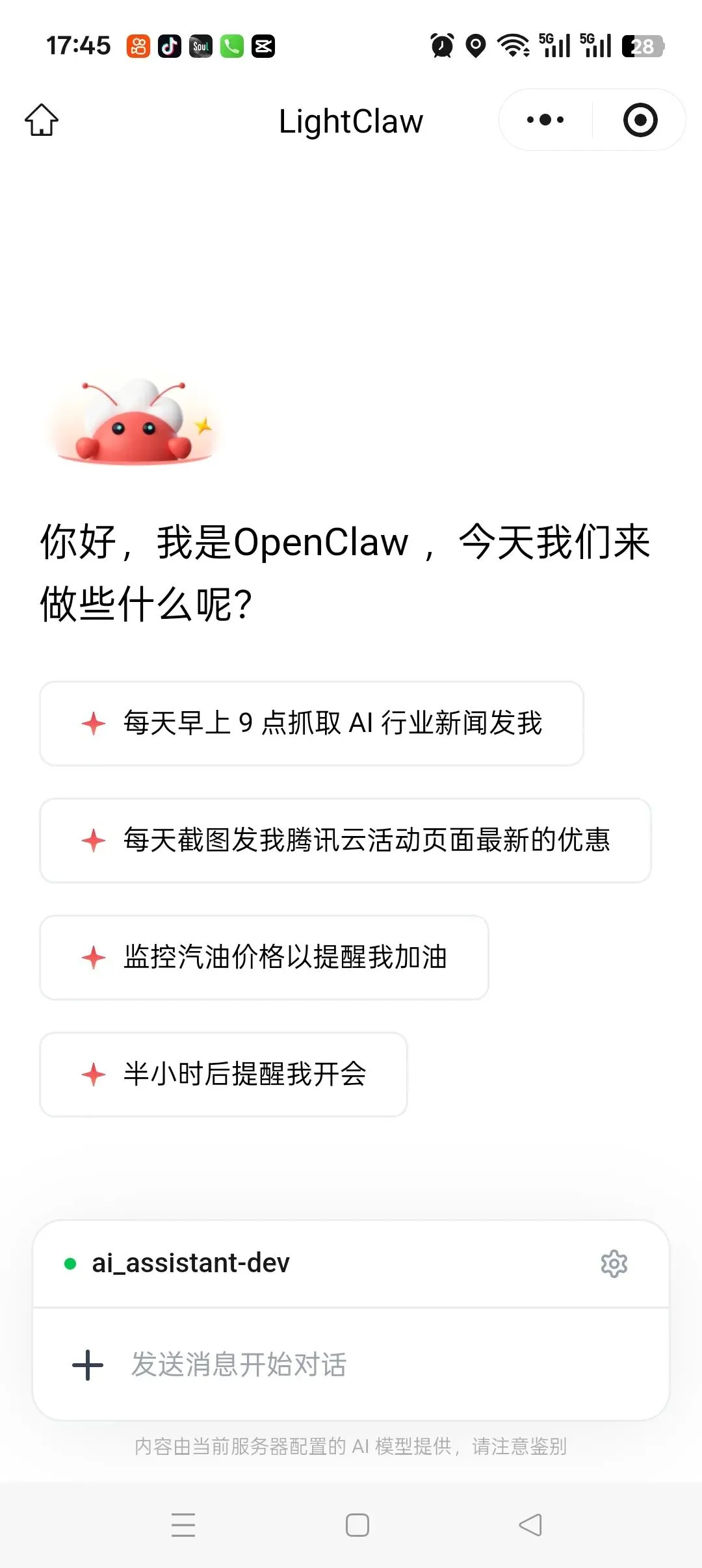 扫码进入LightClaw小程序后,操作简单到离谱: