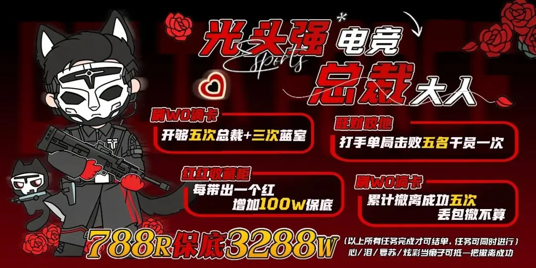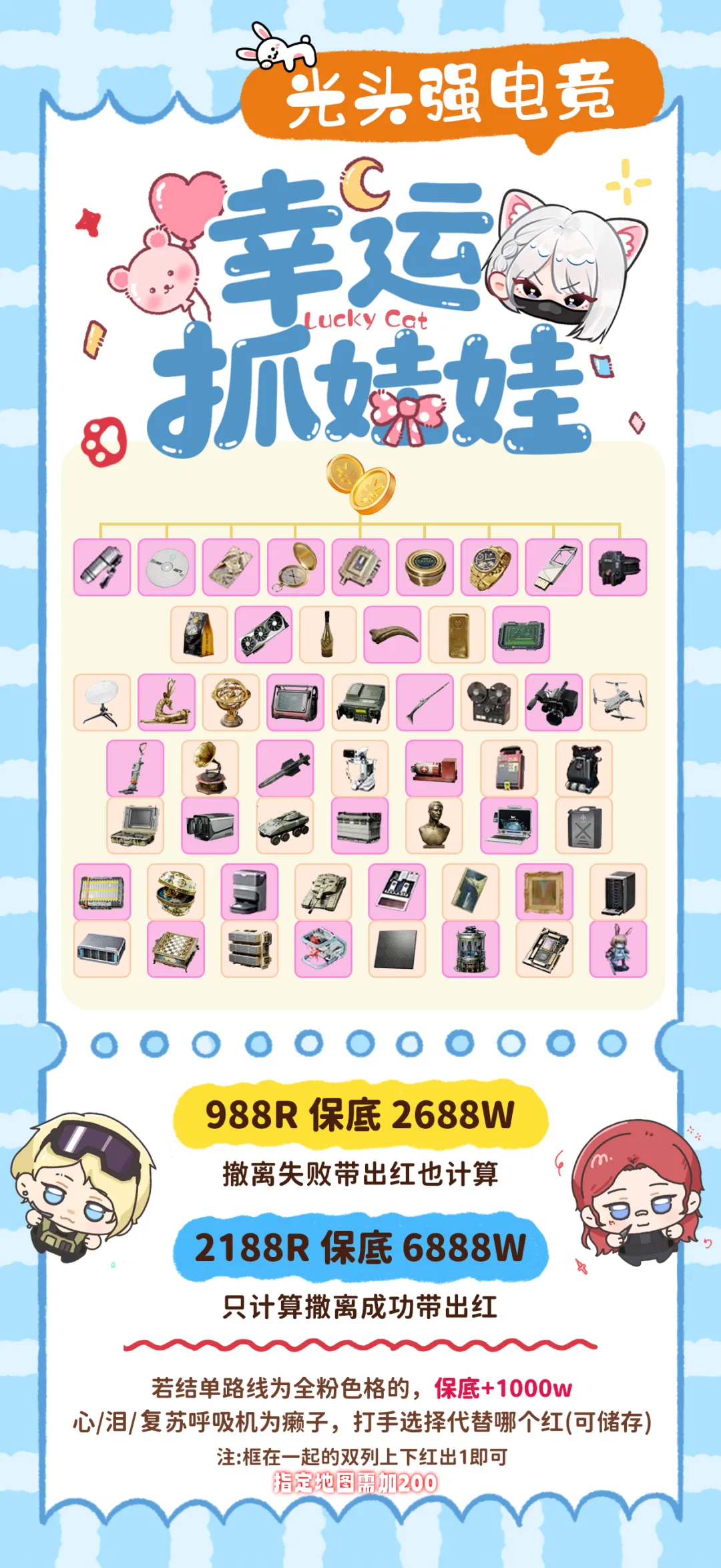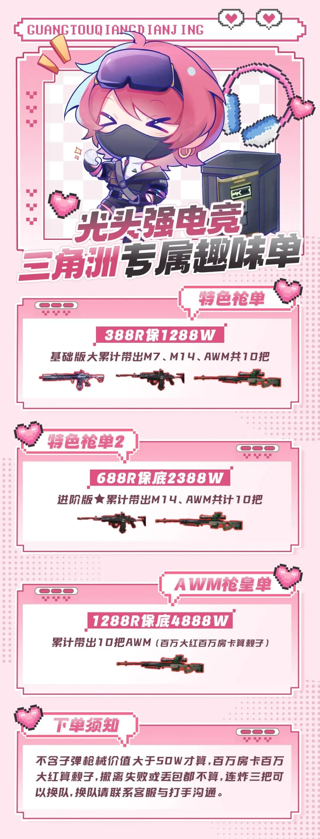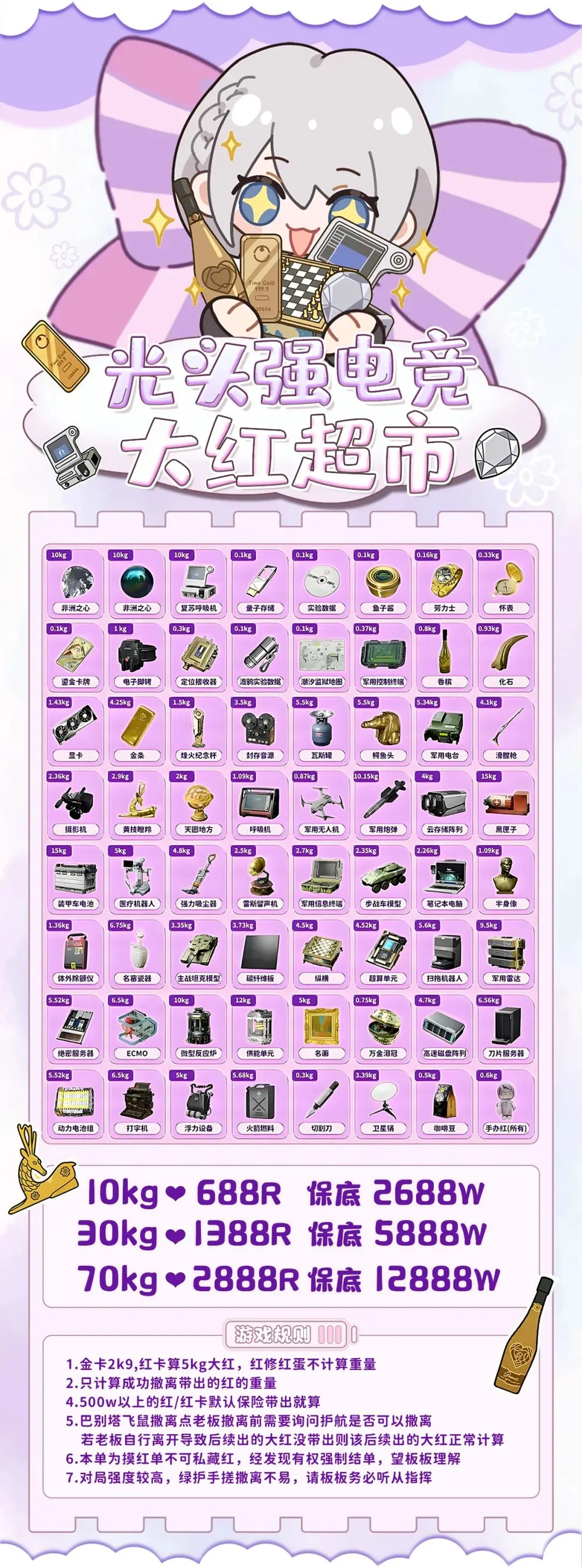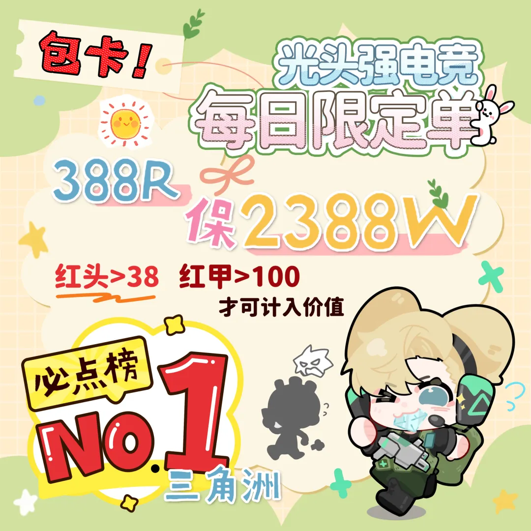 光头强电竞价格表合集速览! 正价护航单 超值保底单:(正价单比别家体验单都便宜) 注:红头修理完耐久>38 红甲修理完耐久>100 红包计入价值 (所有单子统一标准 不分价格) 超绝趣味单 388档次趣味单(所有趣味单炸单正常加保底)推荐:特色枪单 488档趣味单:推荐:Galagame好感度 588档趣味单:推荐:无限续杯(运气好一直吃) 688档趣味单:推荐:大富翁 788档趣味单:推荐:总裁大人(保底撤离五次) 988档趣味单:超绝摸红单 千元档:推荐:超难任务BINGO 究极富哥儿单:打手牛马的一生
