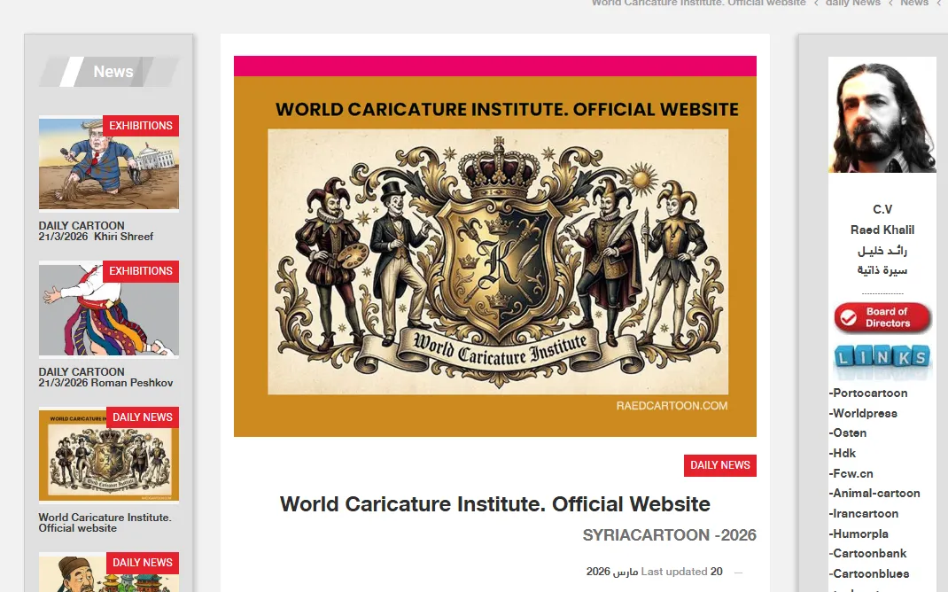 根据叙利亚国际漫画大赛信息网站提供的链接,我们来到了世界讽刺漫画研究院(WCI)的官方网页,如图: