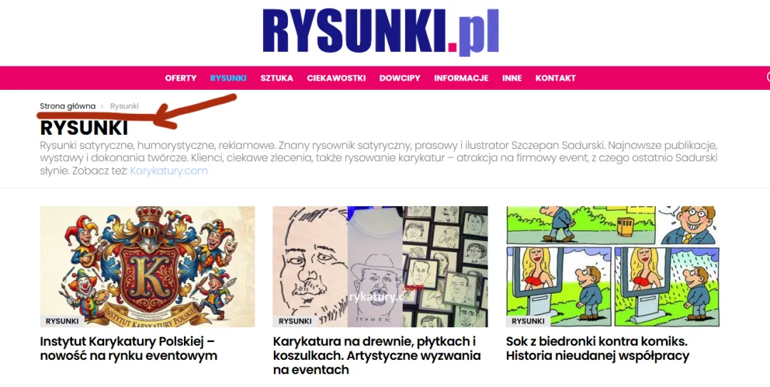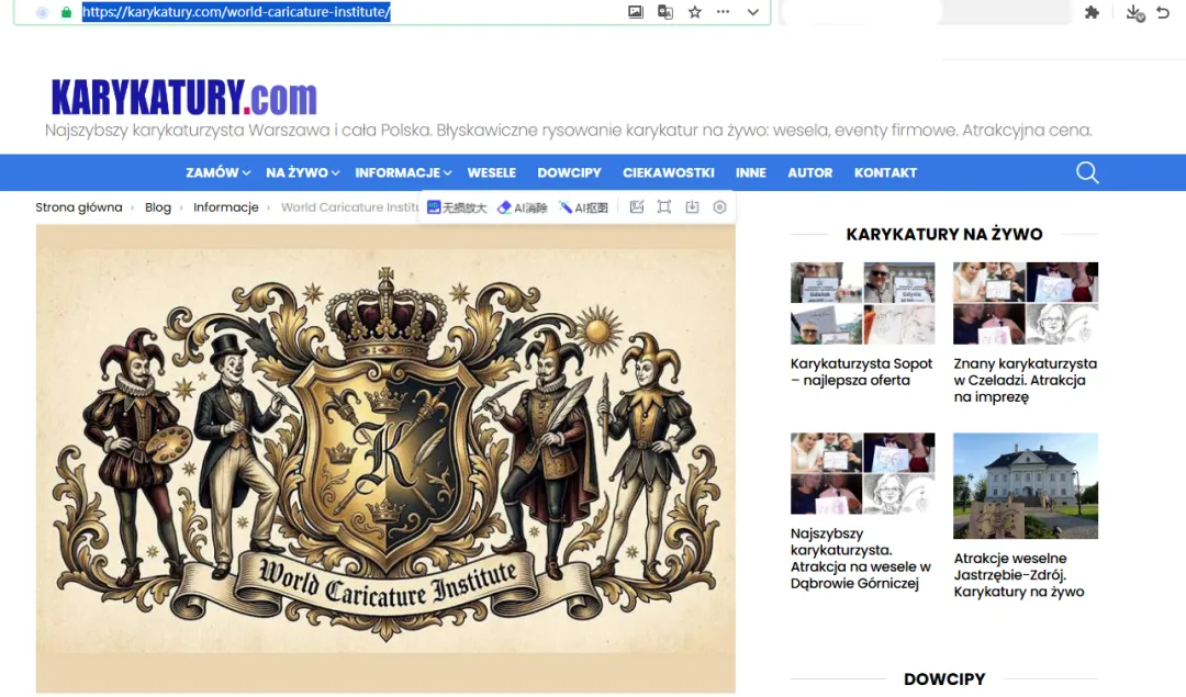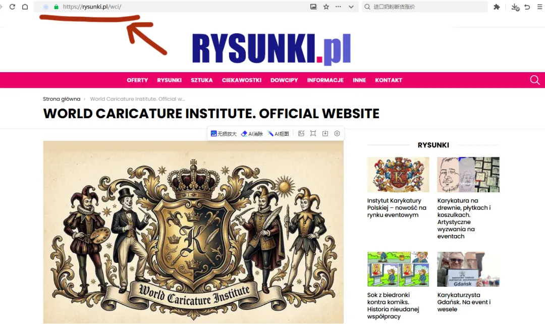 这是一个波兰网站,域名为rysunki.pl,在这个网站下有一个WCI网页,专门介绍WCI (The World Caricature Institute)世界讽刺漫画研究院的相关信息和内容。