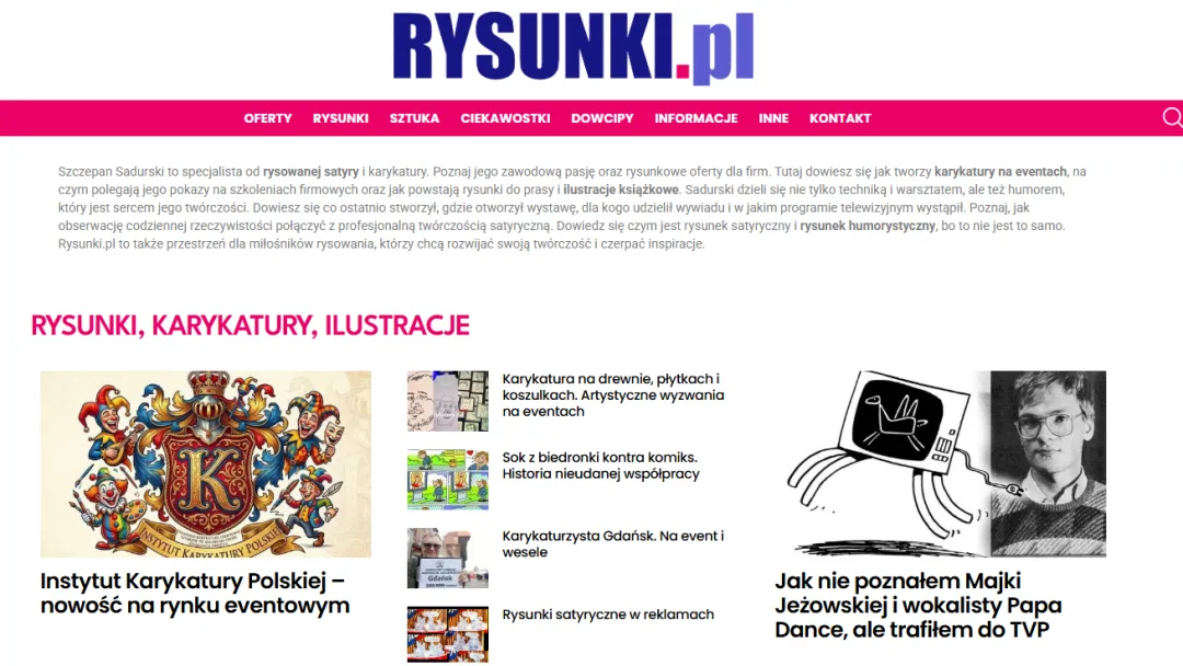 在网站rysunki页面这样介绍,波兰语直译:漫画、幽默、广告、著名的讽刺画家,记者和插画家Szczepan Sadurski。最新的出版物,展览和创意成就。客户,有趣的订单,甚至漫画 – 公司活动的吸引力,最近萨杜尔斯基出名。