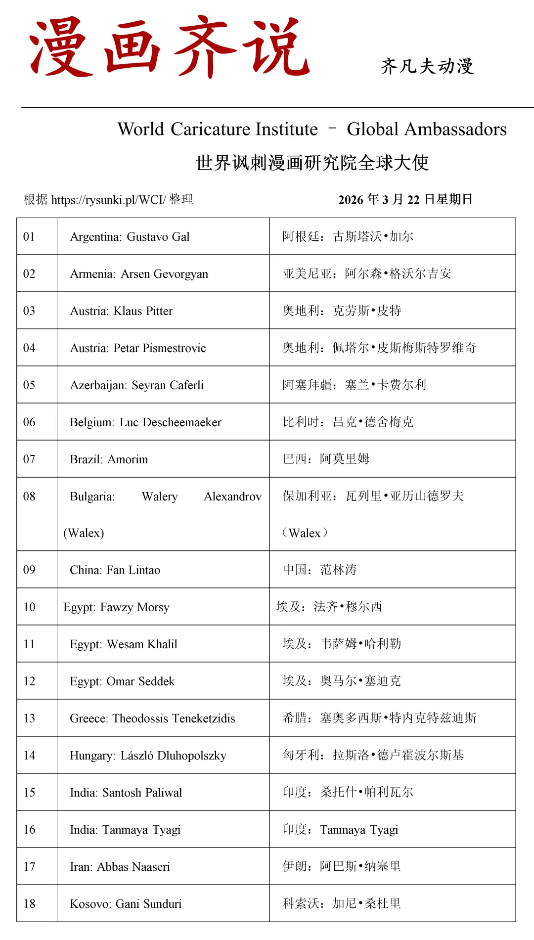 网站公布了WCI (The World Caricature Institute)世界讽刺漫画研究院全球大使名单,共有26个国家34名漫画家成为首批大使,同时还展示了部分作品,名单附下: