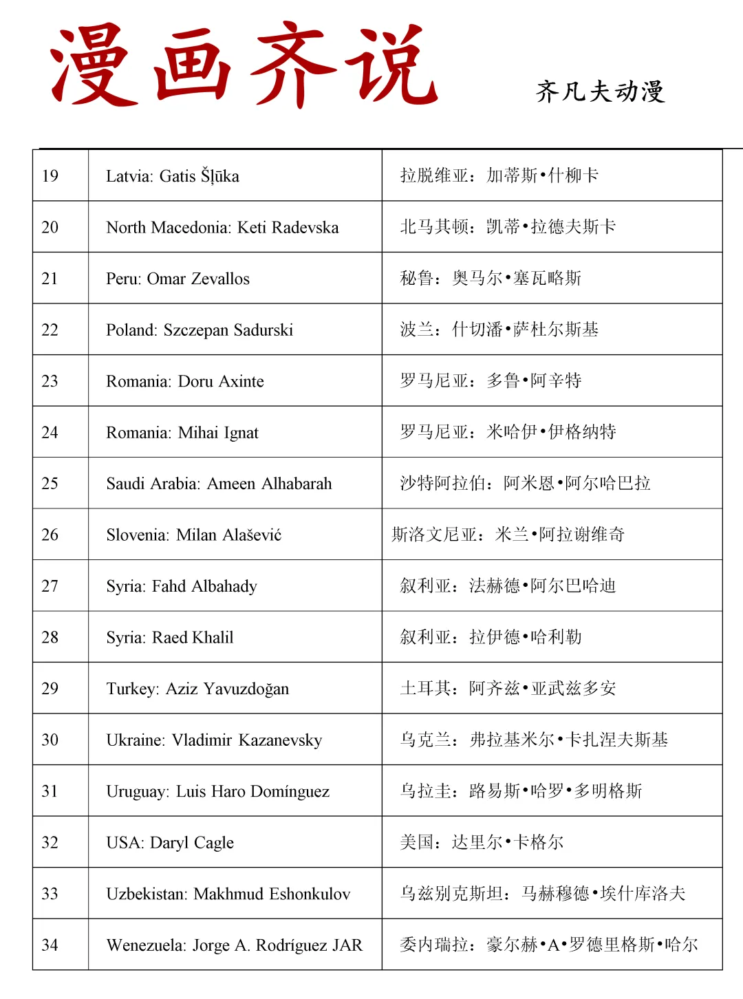 阿根廷Gustavo Gal(古斯塔沃•加尔)、亚美尼亚(Arsen Gevorgyan)阿尔森•格沃尔吉安、奥地利Klaus Pitter(克劳斯•皮特)、奥地利Petar Pismestrovic(佩塔尔•皮斯梅斯特罗维奇)、阿塞拜疆Seyran Caferli(塞兰•卡费尔利)、比利时Luc Descheemaeker(吕克•德舍梅克)、巴西Amorim(阿莫里姆)、保加利亚Walery Alexandrov (亚瓦列里•亚历山德罗夫)、中国Fan Lintao(范林涛)、埃及Fawzy Morsy(法齐•穆尔西)、埃及Wesam Khalil(韦萨姆•哈利勒)、埃及Omar Seddek(奥马尔•塞迪克)、希腊Theodossis Teneketzidis(塞奥多西斯•特内克特兹迪斯)、匈牙利László Dluhopolszky(拉斯洛•德卢霍波尔斯基)、印度Santosh Paliwal(桑托什•帕利瓦尔)、印度Tanmaya Tyagi(泰米亚•泰亚吉)、伊朗Abbas Naaseri(阿巴斯•纳塞里)、科索沃Gani Sunduri(加尼•桑杜里)、拉脱维亚Gatis Šļūka(加蒂斯•什柳卡)、北马其顿Keti Radevska(凯蒂•拉德夫斯卡)、秘鲁Omar Zevallos(奥马尔•塞瓦略斯)、波兰Szczepan Sadurski(斯捷潘•萨杜尔斯基)、罗马尼亚Doru Axinte(多鲁•阿辛特)、罗马尼亚Mihai Ignat(米哈伊•伊格纳特)、沙特阿拉伯Ameen Alhabarah(阿米恩•阿尔哈巴拉)、斯洛文尼Milan Alašević(亚米兰•阿拉谢维奇)、叙利亚Fahd Albahady(法赫德•阿尔巴哈迪)、叙利亚Raed Khalil(瑞德•珂哈里尔)、土耳其Aziz Yavuzdoğan(阿齐兹•亚武兹多安)、乌克兰Vladimir Kazanevsky(弗拉基米尔•卡扎涅夫斯基)、乌拉圭Luis Haro Domínguez(路易斯•哈罗•多明格斯)、美国Daryl Cagle(达里尔•卡格尔)、乌兹别克斯坦Makhmud Eshonkulov(马赫穆德•埃什库洛夫)、委内瑞拉Jorge A. Rodríguez JAR(豪尔赫•A•罗德里格斯•哈尔)