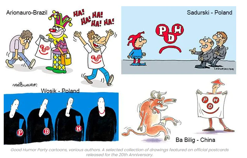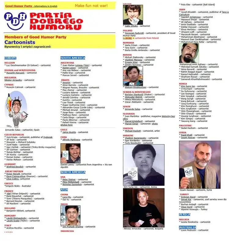 国际漫画家和GHP成员。2005年的历史快照显示了幽默党的全球影响力,该名单在未来几年继续增长。在这张图片中,我们知道有一个国际漫画组织Good-Humor-Party(幽默派对),是由波兰漫画家家Szczepan Sadurski(斯捷潘·萨杜尔斯基)创始成立的,看来这位波兰漫画家此前也挺能折腾的。这里也解释了PDH的含义,是Good-Humor-Party(好幽默派对)波兰语缩写PARTIA DOBREGO HUMORU,即PDH。这张表格有中两位中国漫画家的名字,在亚洲中国那一栏里,一个名字是LENG MU,一个是GAI YU,这两个名字,第一个名字是冷牧,这是一位与夏大川、金晖同一时期参赛的中国国际漫画家,是上世纪八九十年代的中国国际漫画代表人物,还曾经举办过“冷牧杯”国际漫画大赛,编著出版过《2002世界漫画名作》,而后期不知道什么原因,淡出了国际漫画大赛平台。另一个从汉语拼音来看是盖敔,也是国际漫画大赛的常客,但近些年似乎淡出了,小编一度认为,盖姓很少,盖姓漫画家更少,似乎与已故著名漫画家盖桂保有些联系,却无从考证。从冷牧的名字可以判断出,这位波兰漫画家是一位年龄不小的漫画家,虽然从照片中无法判断年龄,但至少在60岁以上,70岁左右的年龄,因而也才有这样的人脉资源。