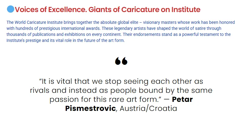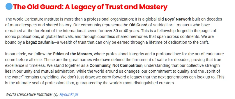 世界讽刺漫画研究院不仅仅是一个专业组织;这是一个建立在几十年相互尊重和共同历史基础上的全球老男孩网络。我们的社区代表了讽刺艺术的老卫士——30多年来一直处于国际舞台前沿的大师。这是在标志性出版物的页面上、在全球节日上以及在跨越各大洲的无数共同记忆中建立的友谊。我们被bagažzaufania所束缚,这是一种财富的信任,只有通过一生对工艺的奉献才能获得。
