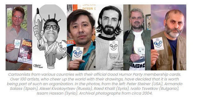 来自各国的漫画家们手持他们的官方“好心情派对”会员卡。100多位艺术家,用他们的画作给世界带来欢乐,他们认为加入这样一个组织是值得的。照片中,从左至右分别为:彼得·斯坦纳(美国)、阿曼多·萨拉斯(西班牙)、阿列克谢·基沃科伊尔采夫(俄罗斯)、拉德·哈利勒(叙利亚)、伊瓦伊洛·茨维特科夫(保加利亚)、伊萨姆·哈桑(叙利亚)。这些照片大约拍摄于2004年。