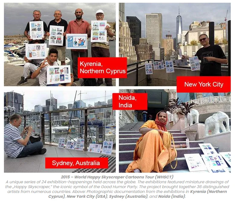 一系列独特的24场展览活动在全球各地举行。展览展出了“幸福摩天大楼”的微型画作,这是好心情派对的标志性象征。该项目汇集了来自多个国家的36位杰出艺术家。上图:凯里尼亚(北塞浦路斯)、纽约市(美国)、悉尼(澳大利亚)和诺伊达(印度)展览的照片记录。