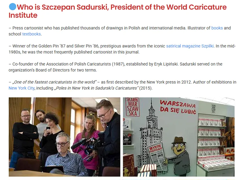 “世界上最快的漫画家之一”——2012年纽约媒体首次这样描述。纽约市展览的作者,包括“Sadurski漫画中的纽约波兰人”(2015)。波兰漫画家Szczepan Sadurski在60到99秒内画了一幅漫画,目前正在制作一部关于他的生活和工作的纪录片。照片中的特色是:萨杜斯基插图的一本书(在华沙书展上展出),一篇以他的讽刺画为特色的新闻采访,以及标志性讽刺周刊《Szpilki》的封面,上面有萨杜斯基的原创作品。