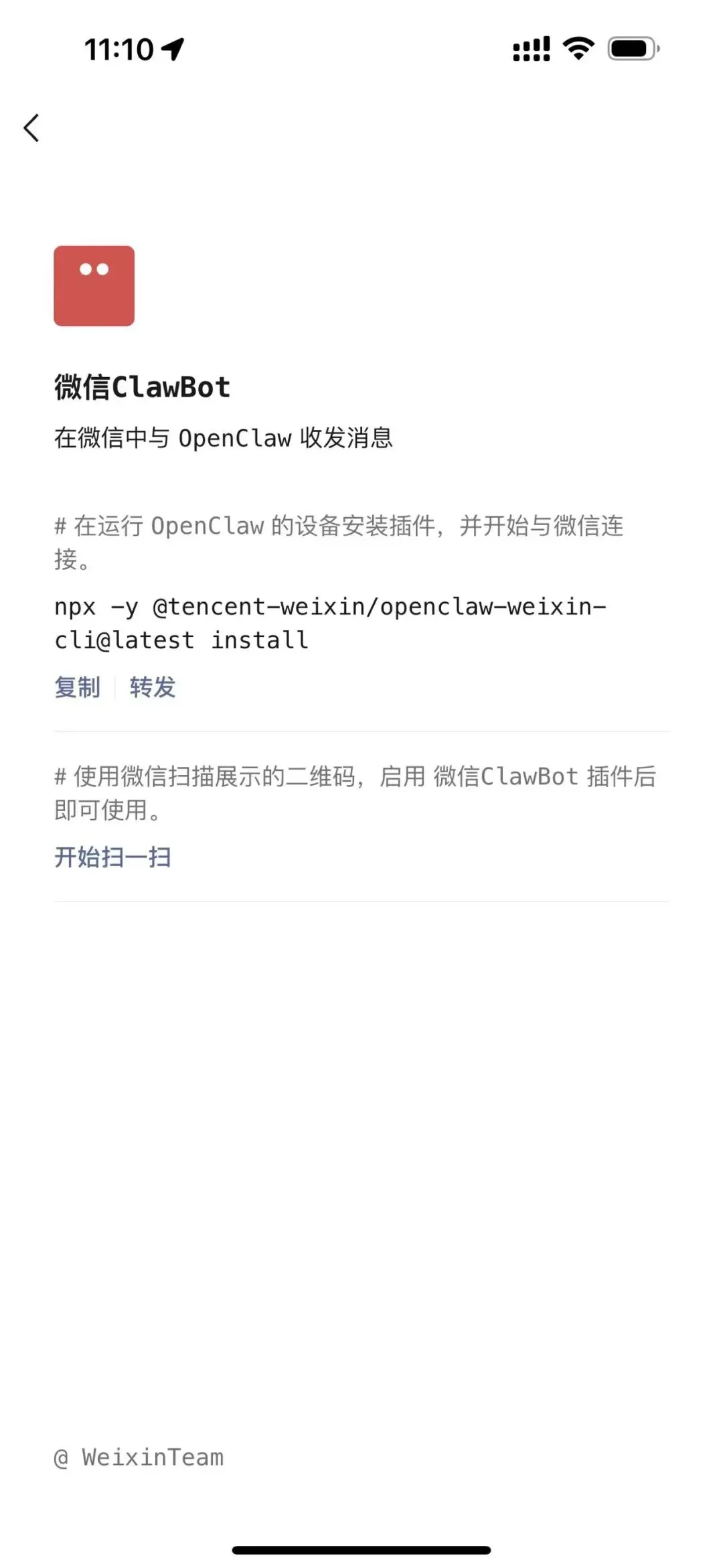 用户扫码或复制命令,即可将 OpenClaw 接入微信。