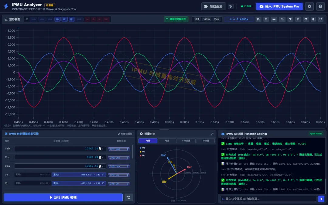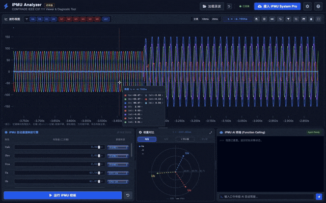 波形对齐功能需配置 iPMU API 连接(右上角按钮设置),公测开放后可自行申请账号。AI 智能诊断功能暂未开放,后续开放时间请留意 iPMU 系统内通知。