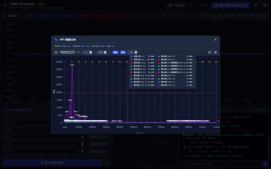 内置 AI 对话终端,可基于当前光标位置自动提取三周波范围内的谐波特征(1~21 次谐波 + THD),发送至 iPMU AI 诊断引擎进行分析。不需要手动整理数据,点一下快捷指令,AI 直接基于当前波形给出诊断建议。(AI 诊断功能暂未正式开放,届时请关注 iPMU 系统通知。)