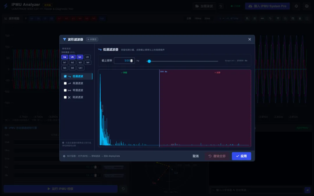提供低通、高通、带通、陷波四种频域滤波类型,每种滤波器都有独立的频域实时预览——调节截止频率时,可以直观看到保留和去除的频段。一键”去除 50Hz 基波”可以快速观察谐波成分。所有滤波操作支持一键撤销,恢复原始波形。
