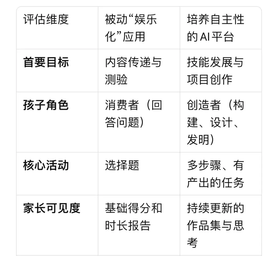 · AI聊天机器人:开放式的对话工具。虽然能快速回答问题,但缺乏结构化引导,对孩子的学习之旅而言,容易变成无目的的信息海洋。