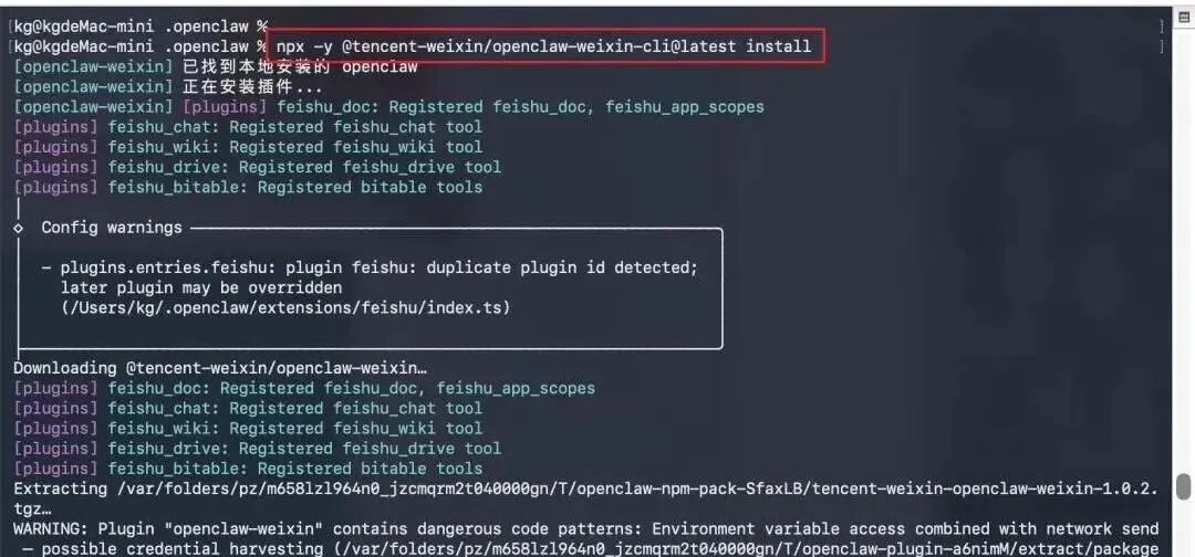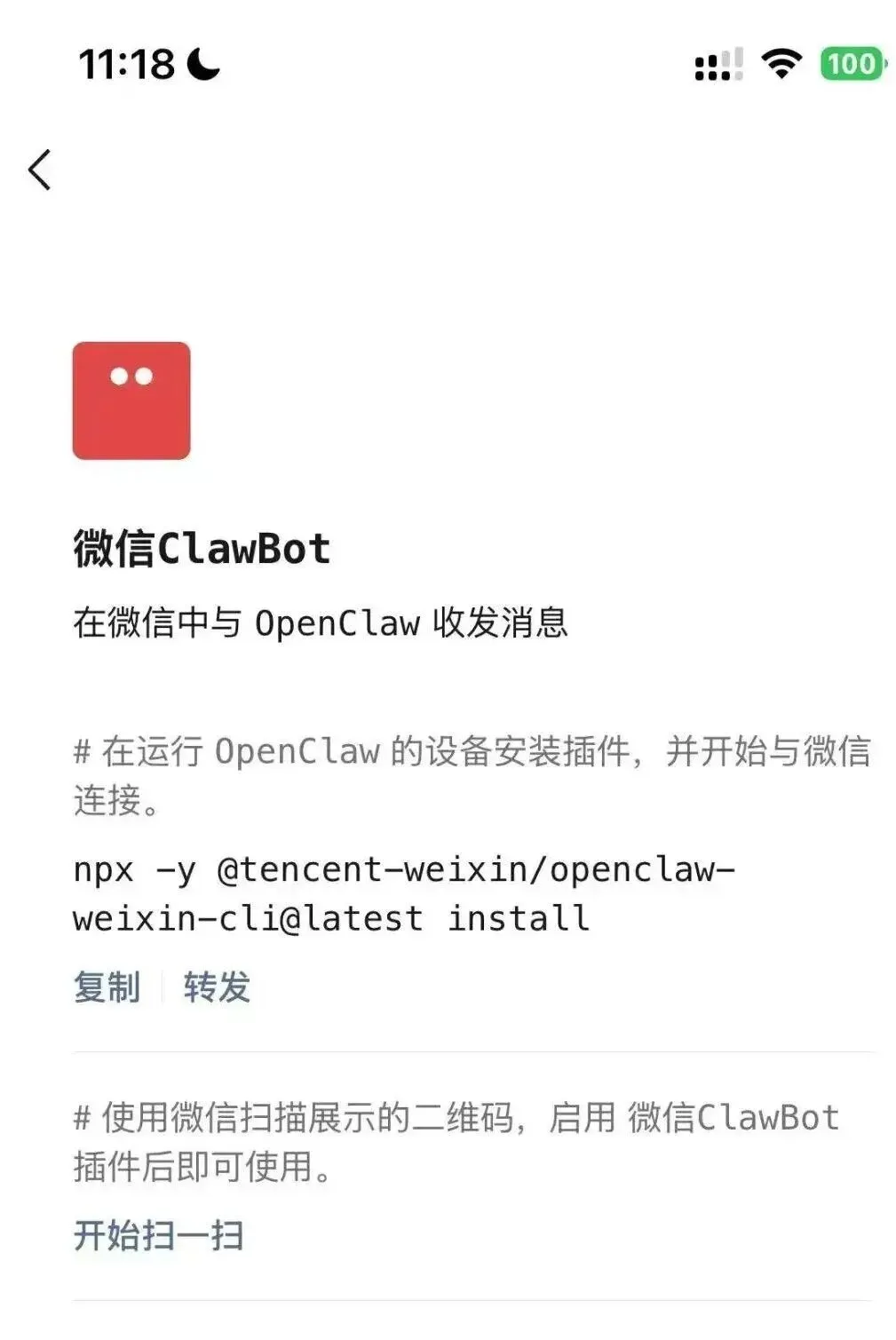 绑定OpenClaw:两种方式任选其一——要么在OpenClaw运行环境输入官方命令 npx -y @tencent-weixin/openclaw-weixin-cli@latest install,要么直接扫描插件页面的二维码,一键完成绑定。