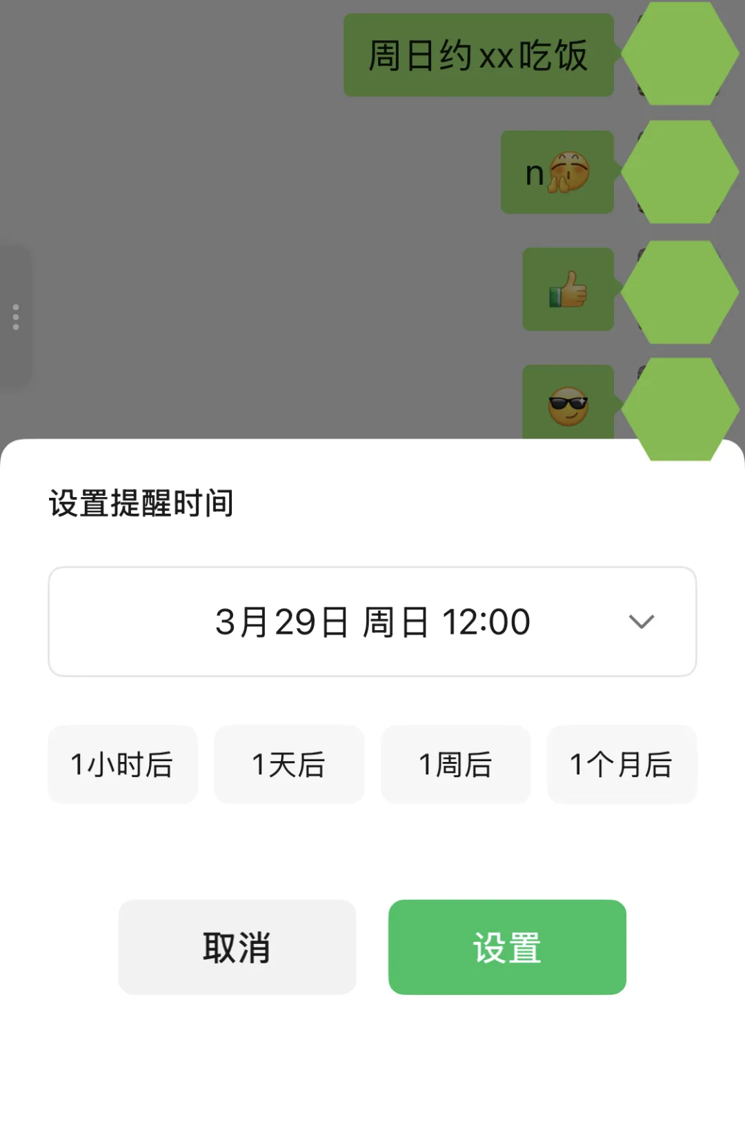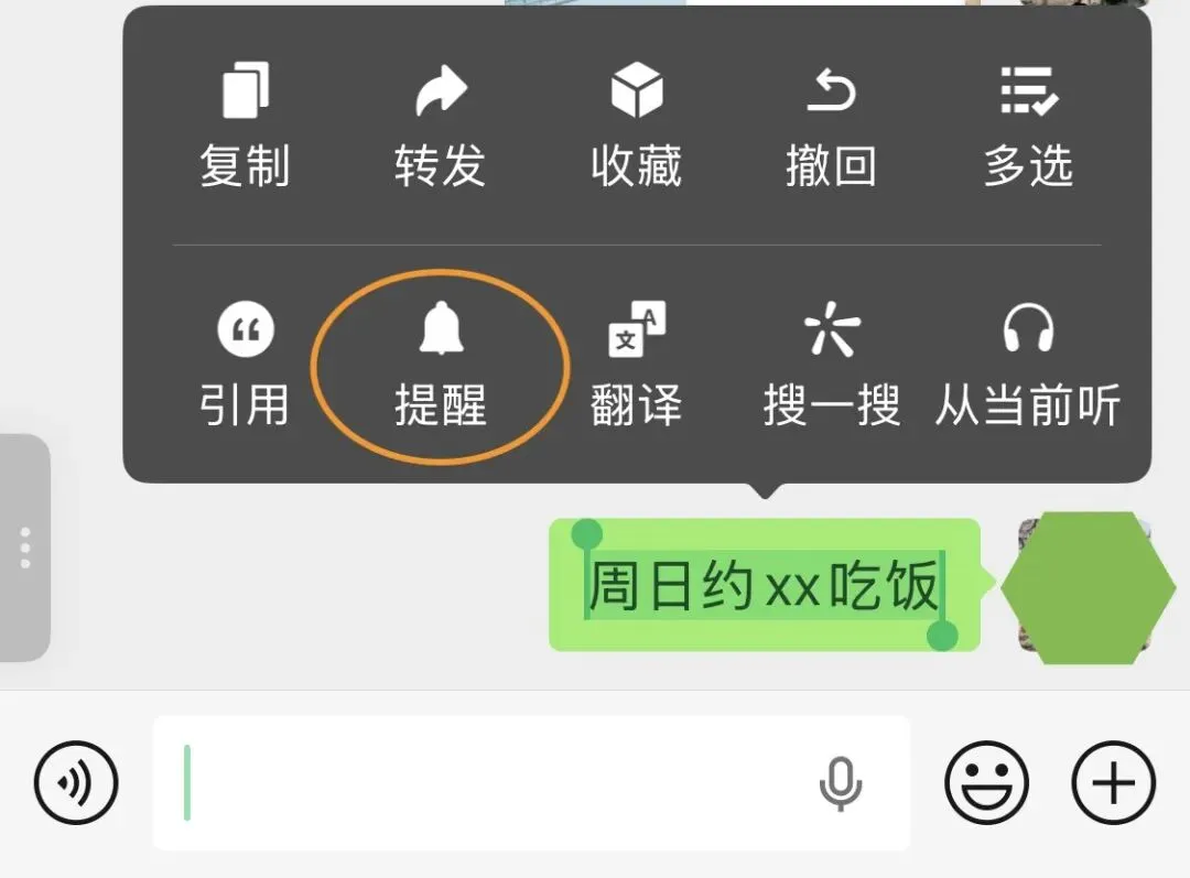 微信的提醒功能:在你跟朋友的对话中,有关时间的内容,只要你长按内容,微信会跳出更多选项,可以选择“提醒”功能,如下: