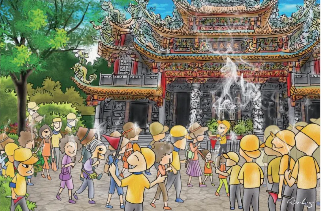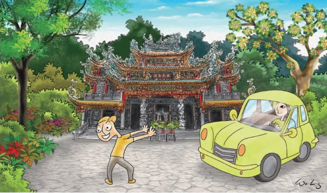 2. 山前是一座辉煌的宫庙,庙埕小小的,她上了停在那儿的车,准备下山。