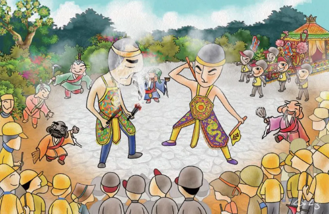 6. 队伍前,好几位乩童也已经摆好架势,手执香丛和各种法器,准备起驾。
