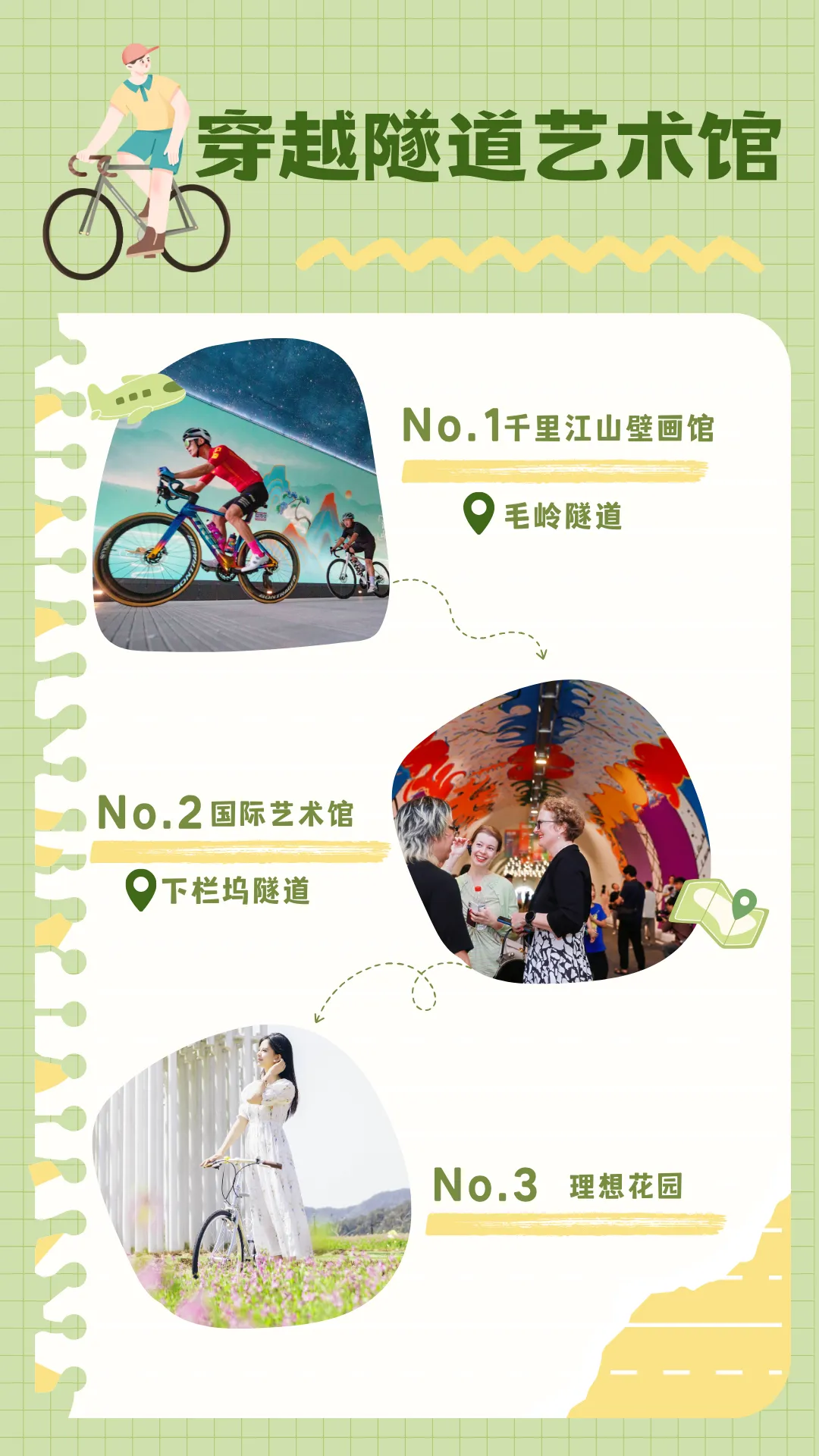 该路线全程仅4公里,路面平坦,堪称千岛湖为新手准备的“春日彩蛋”。一次可打卡三个点位:千里江山壁画馆、国际艺术馆、理想花园。隧道免费开放,骑行即观展。