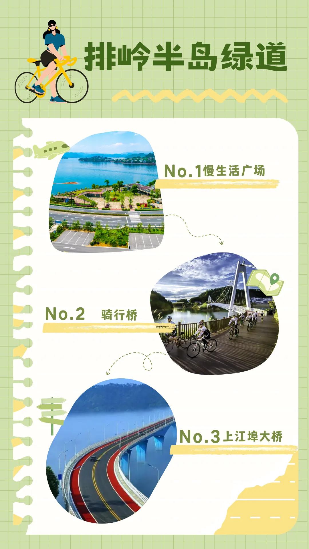 从慢生活广场出发至上江埠大桥,全程7.3公里,分成红、绿、蓝、紫四种颜色,代表春、夏、秋、冬四个季节,还建有鹅卵石路段、起伏路段等趣味体验路段。