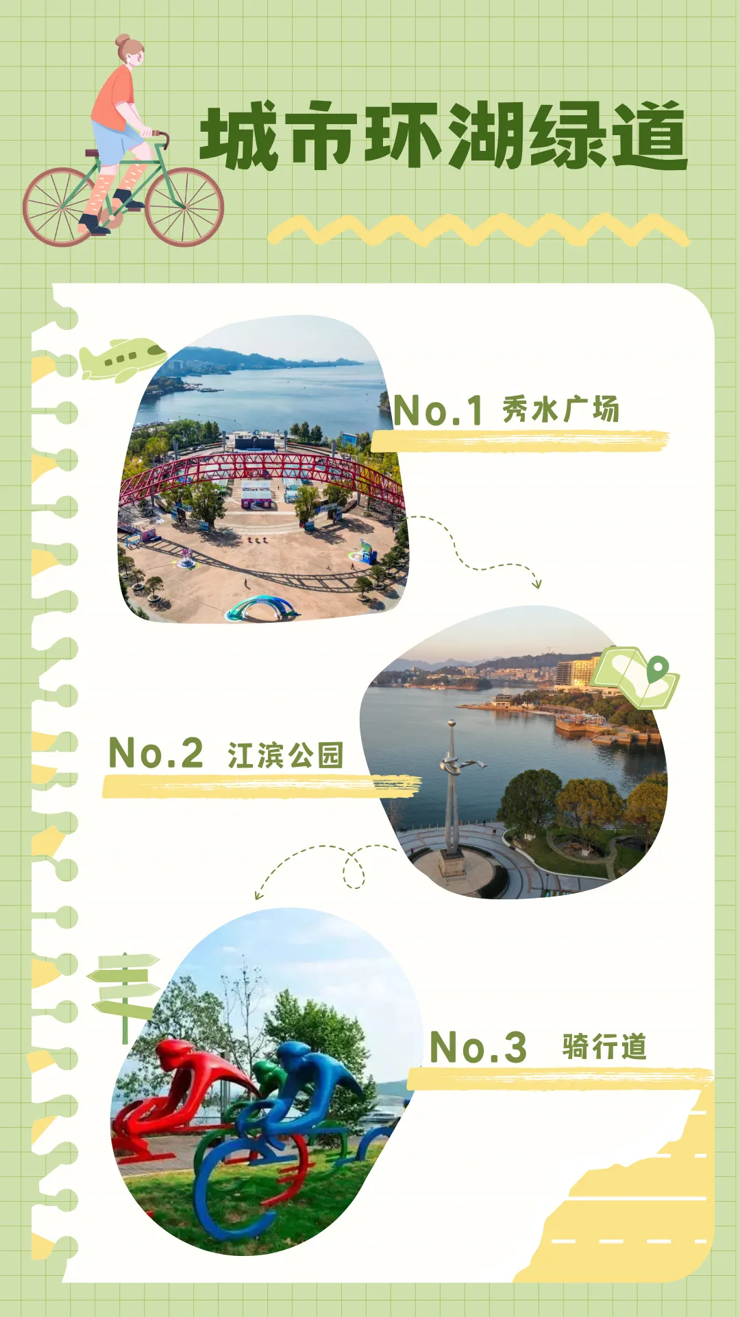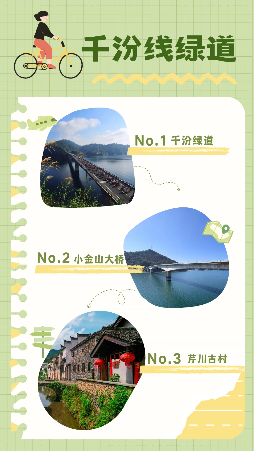 千汾绿道全长约60公里,大部分路段傍山临湖,绿树成荫,主打一个原汁原味。千汾绿道沿途有许多景观平台和骑行驿站,方便驻足欣赏湖光山色。
