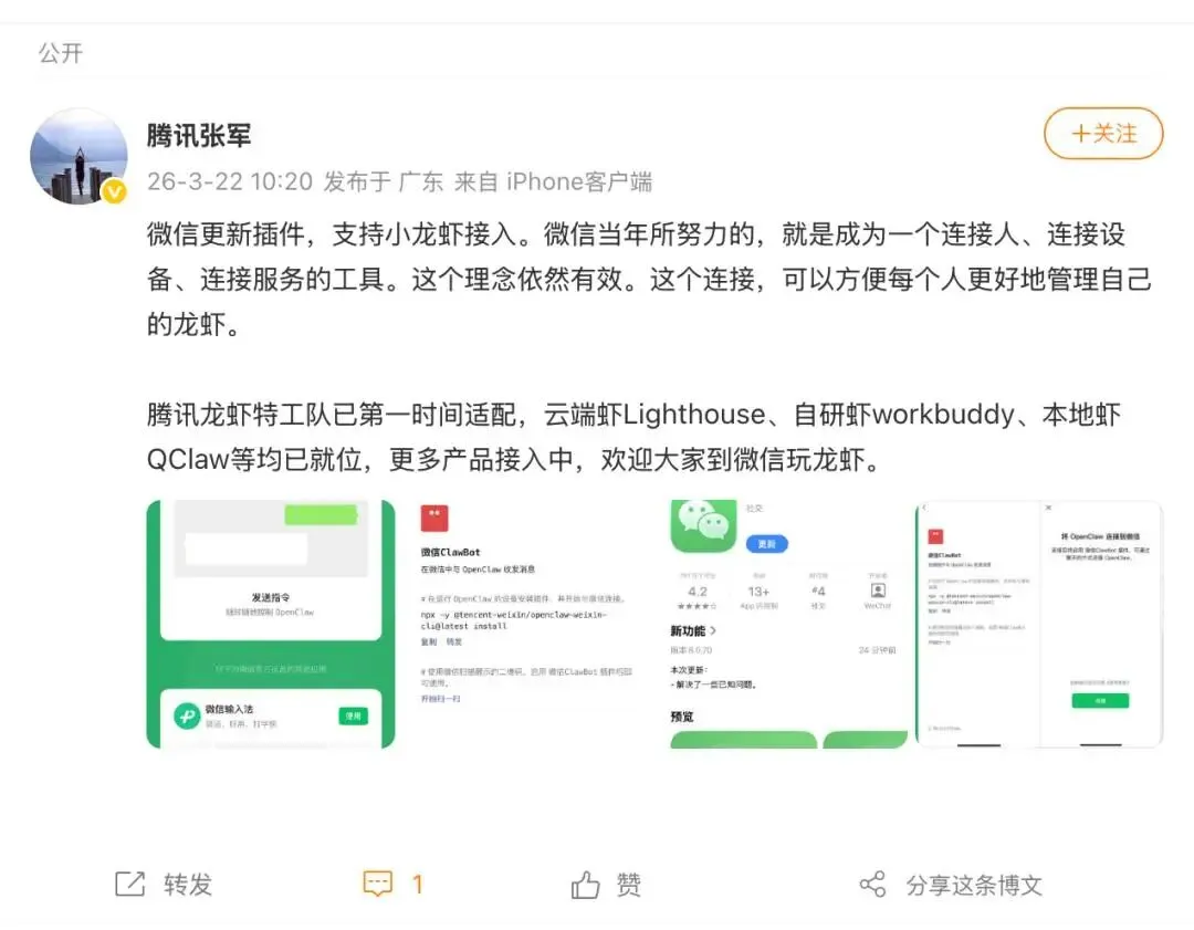 微信更新插件支持小龙虾接入,腾讯张军回应