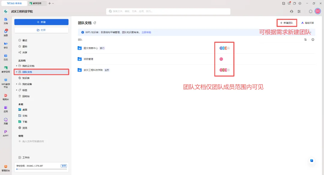 所有师生均可自由组建团队。不论是班级资料、课件,还是扩展阅读资料、通知文件,只要是对班级/部门/协会/社团/课题组等集体有用的文件都可以用这种方式保存,全团队共享(仅本团队成员可见),随取随用。