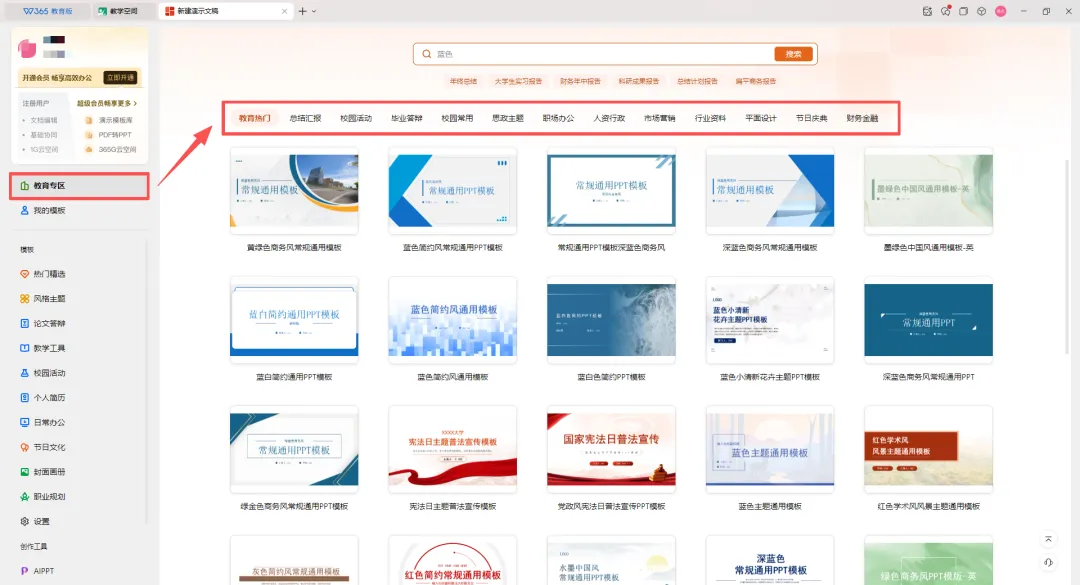 海量模板任选,更有学校模板空间,满足多种使用场景。让你专注内容创作,无需再为版式担忧。模板库入口:【新建】—【演示】—【教育专区】