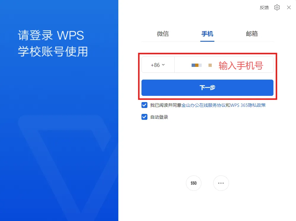 选择合适的系统版本进行下载安装。按照以下步骤使用手机号激活并登录我校WPS账号: