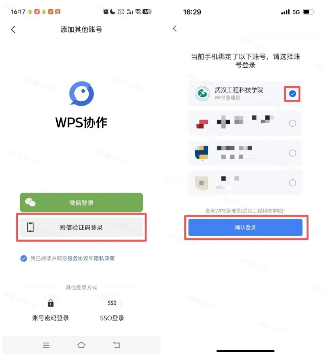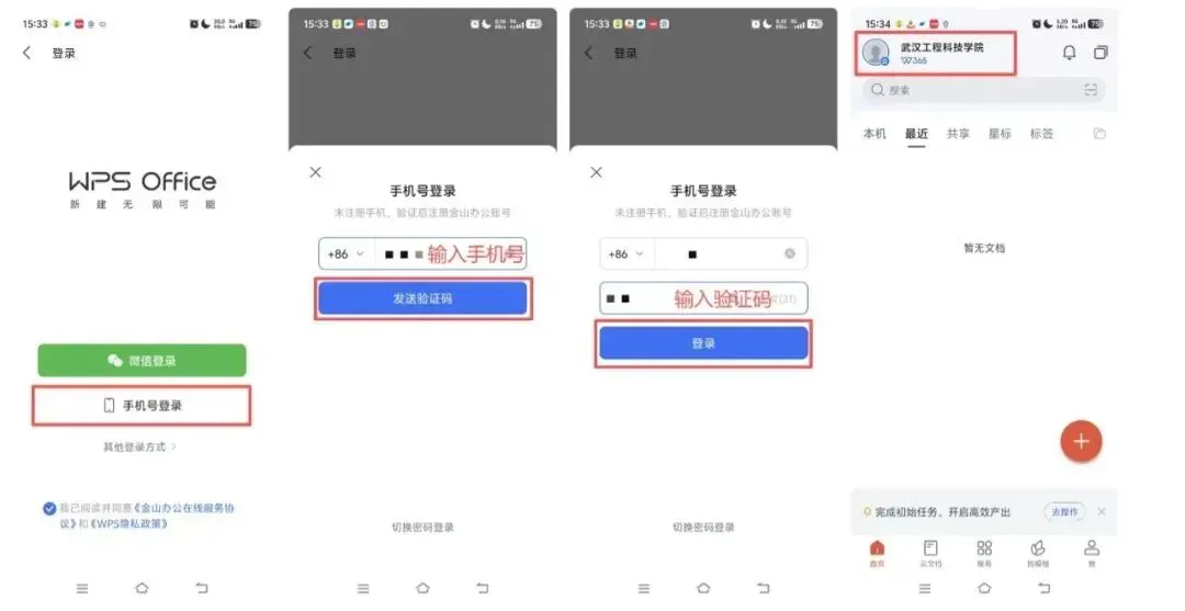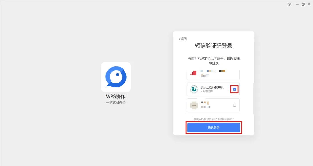 激活WPS Office账号后,打开WPS协作客户端—选择【短信验证码登录】—输入手机号和验证码—选择武汉工程科技学院账号点击【确认登录】即可使用校园账号。