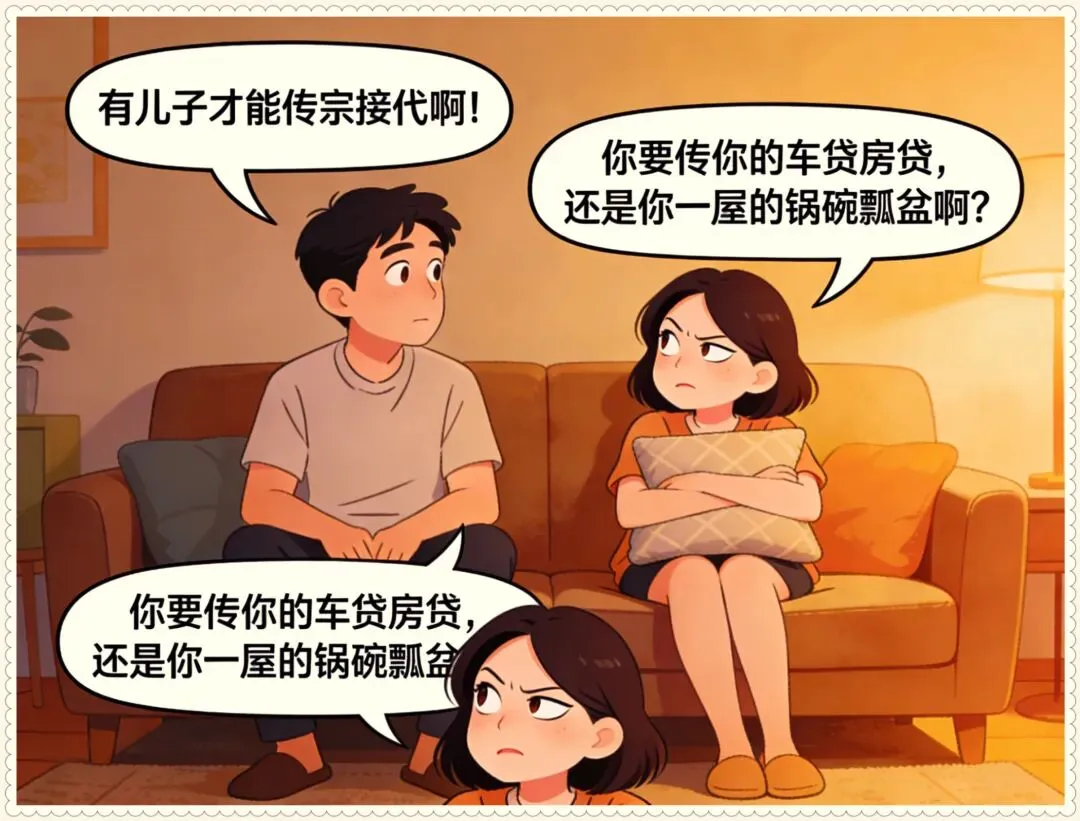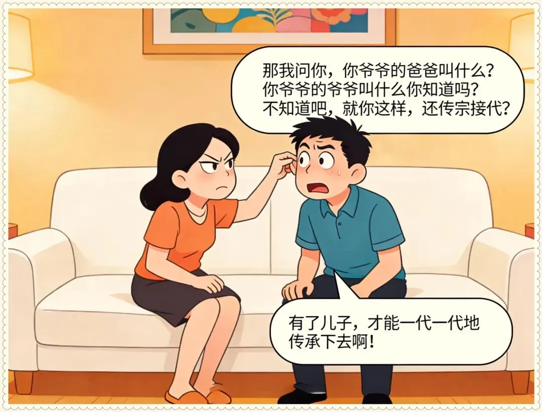 趣味漫画:关于生儿子的必要性讨论,男:你必须给我生个儿子,女:为啥?男:传种接代,你连你爷爷的爸爸叫啥都不知道,接个der啊!