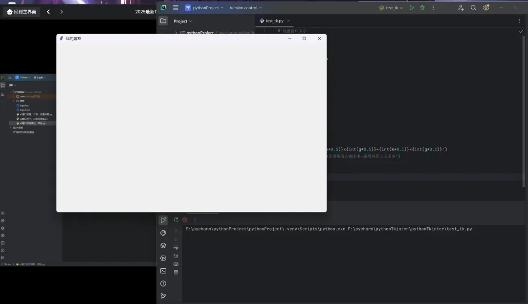 # 设置窗口大小# 设置窗口打开位置# 获取用户分辨率import tkinter as tk# 创建窗口a1 = tk.Tk()# 设置窗口标题a1.title('我的游戏')# 获取用户分辨率a2 = a1.maxsize()k, g = a2# 设置窗口大小# 设置窗口打开位置a1.geometry(f'{int(k*0.5)}x{int(g*0.5)}+{int(k*0.1)}+{int(g*0.1)}')# a1.geometry('宽x高+距离屏幕左侧多少+距离屏幕上方多少')# 开启窗口/主循环a1.mainloop()