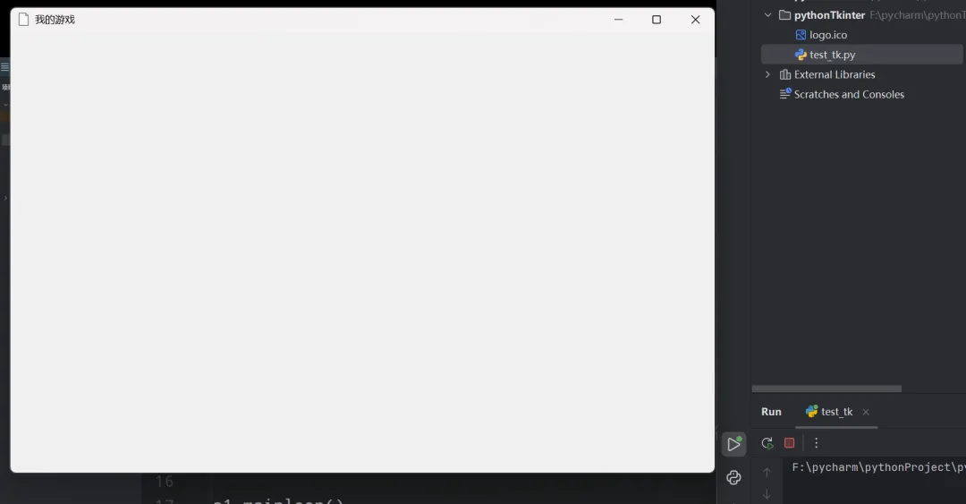 # 设置窗口锁定缩放# 设置窗口图标import tkinter as tk# 创建窗口a1 = tk.Tk()# 设置窗口标题a1.title('我的游戏')# 获取用户分辨率a2 = a1.maxsize()k, g = a2# 设置窗口大小# 设置窗口打开位置a1.geometry(f'{int(k*0.5)}x{int(g*0.5)}+{int(k*0.1)}+{int(g*0.1)}')# a1.geometry('宽x高+距离屏幕左侧多少+距离屏幕上方多少')# 设置窗口锁定缩放a1.resizable(width=True, height=False) # 默认True,可缩放# 设置窗口图标a1.iconbitmap('logo1.ico') # 可以传相对路径和绝对路径,建议相对路径# 开启窗口/主循环a1.mainloop()