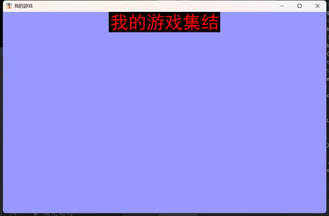 # 标签组件 Label# 填充布局 pack()import tkinter as tk# 创建窗口a1 = tk.Tk()# 设置窗口标题a1.title('我的游戏')# 获取用户分辨率a2 = a1.maxsize()k, g = a2# 设置窗口大小# 设置窗口打开位置a1.geometry(f'{int(k*0.5)}x{int(g*0.5)}+{int(k*0.1)}+{int(g*0.1)}')# a1.geometry('宽x高+距离屏幕左侧多少+距离屏幕上方多少')# 设置窗口锁定缩放a1.resizable(width=True, height=True) # 默认True,可缩放# 设置窗口图标a1.iconbitmap('logo1.ico') # 可以传相对路径和绝对路径,建议相对路径# 设置窗口背景颜色 # 可以写颜色英文和颜色编码a1.configure(bg='#9999ff')# 设置窗口透明度 # 第一个位置传参,字符串'-alpha',后面是数字 0-1 之间a1.attributes('-alpha', 1)# 设置窗口置顶a1.attributes('-topmost', True)def guan():print('关闭窗口执行函数')# 销毁窗口a1.destroy()# 设置窗口关闭时执行的函数 WM_DELETE_WINDOWa1.protocol('WM_DELETE_WINDOW', guan)# 标签组件 Labela2 = tk.Label(a1, text='我的游戏集结', font=('黑体', 36), fg='red', bg='#000000')# 填充布局 pack()a2.pack()# 开启窗口/主循环a1.mainloop()