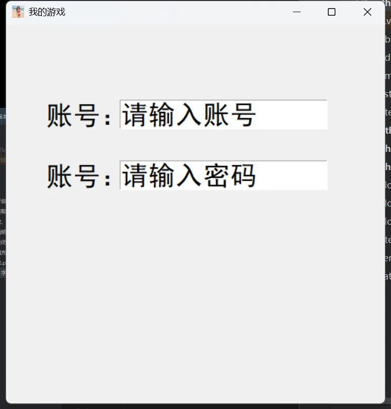 # 输入框组件 Entry# 字符串变量 StringVarimport tkinter as tka1 = tk.Tk()a1.title('我的游戏')a1.geometry('500x500+100+100')a1.resizable(width=True, height=True)a1.iconbitmap('logo1.ico')tk.Label(a1, text='账号:', font=('黑体', 26)).place(x=50, y=100)tk.Label(a1, text='账号:', font=('黑体', 26)).place(x=50, y=180)# 创建字符串变量s1 = tk.StringVar()# 当成提示文本s1.set('请输入账号')s2 = tk.StringVar()s2.set('请输入密码')# 输入框组件 Entrytk.Entry(a1, textvariable=s1, width=15, font=('黑体', 26)).place(x=150, y=100)tk.Entry(a1, textvariable=s2, width=15, font=('黑体', 26)).place(x=150, y=180)# 开启窗口/主循环a1.mainloop()
