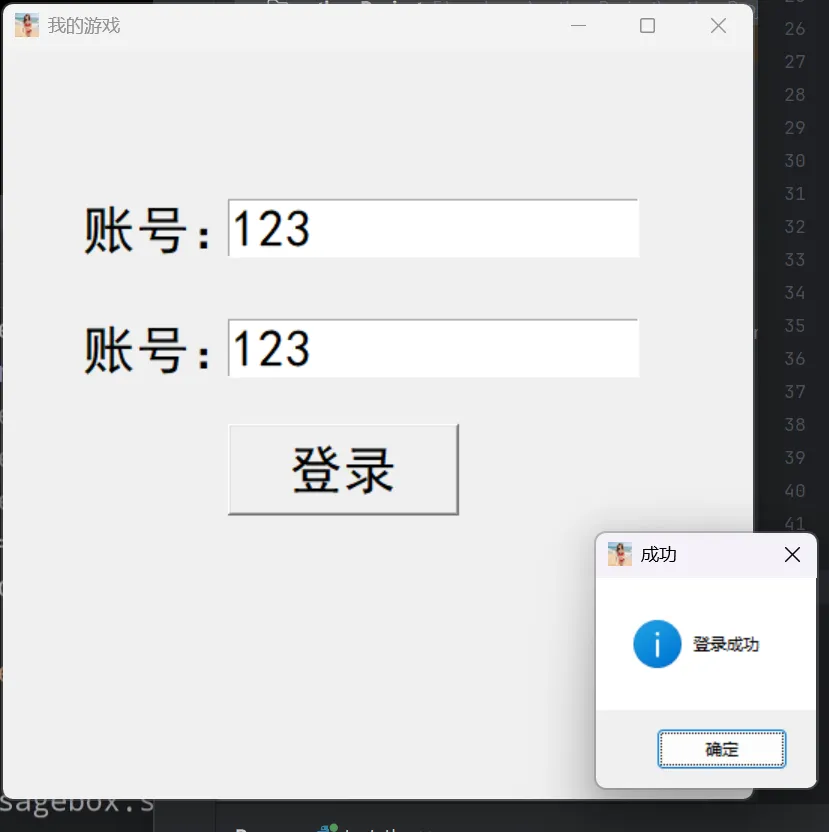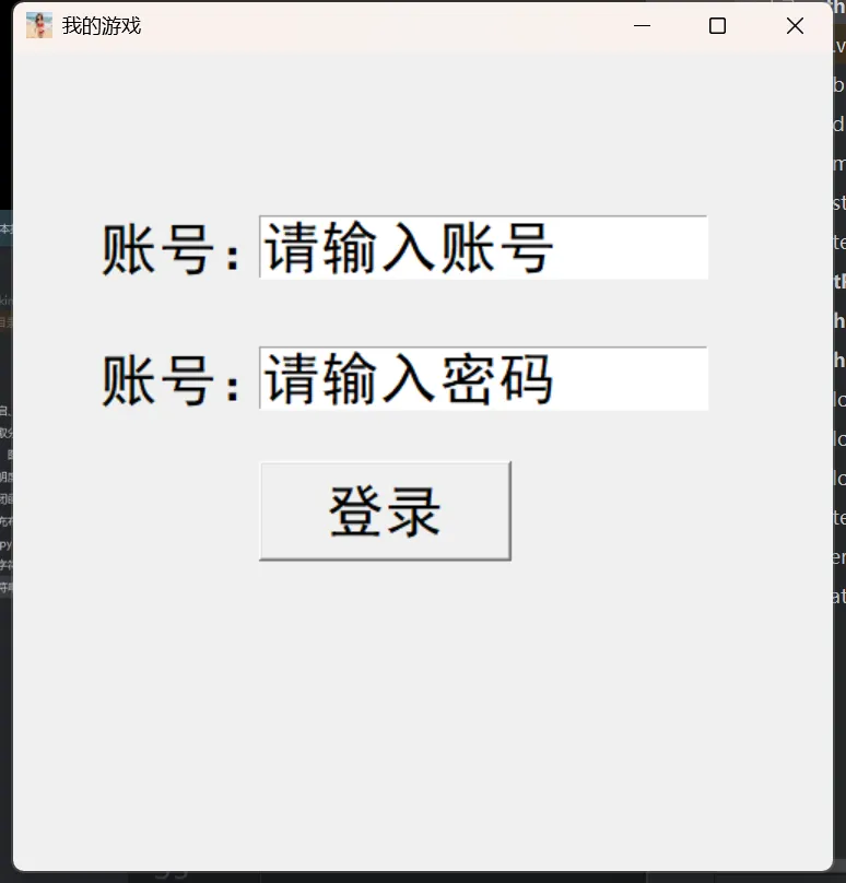 # 按钮组件Button# 字符串变量获取import tkinter as tka1 = tk.Tk()a1.title('我的游戏')a1.geometry('500x500+100+100')a1.resizable(width=True, height=True)a1.iconbitmap('logo1.ico')tk.Label(a1, text='账号:', font=('黑体', 26)).place(x=50, y=100)tk.Label(a1, text='账号:', font=('黑体', 26)).place(x=50, y=180)# 创建字符串变量s1 = tk.StringVar()# 当成提示文本s1.set('请输入账号')s2 = tk.StringVar()s2.set('请输入密码')# 输入框组件 Entrytk.Entry(a1, textvariable=s1, width=15, font=('黑体', 26)).place(x=150, y=100)tk.Entry(a1, textvariable=s2, width=15, font=('黑体', 26)).place(x=150, y=180)def d1():print('ooaac')# 字符串变量获取print(s1.get())print(s2.get())# 按钮组件tk.Button(a1, command=d1, text='登录', font=('黑体', 26), width=8).place(x=150, y=250)# 开启窗口/主循环a1.mainloop()