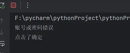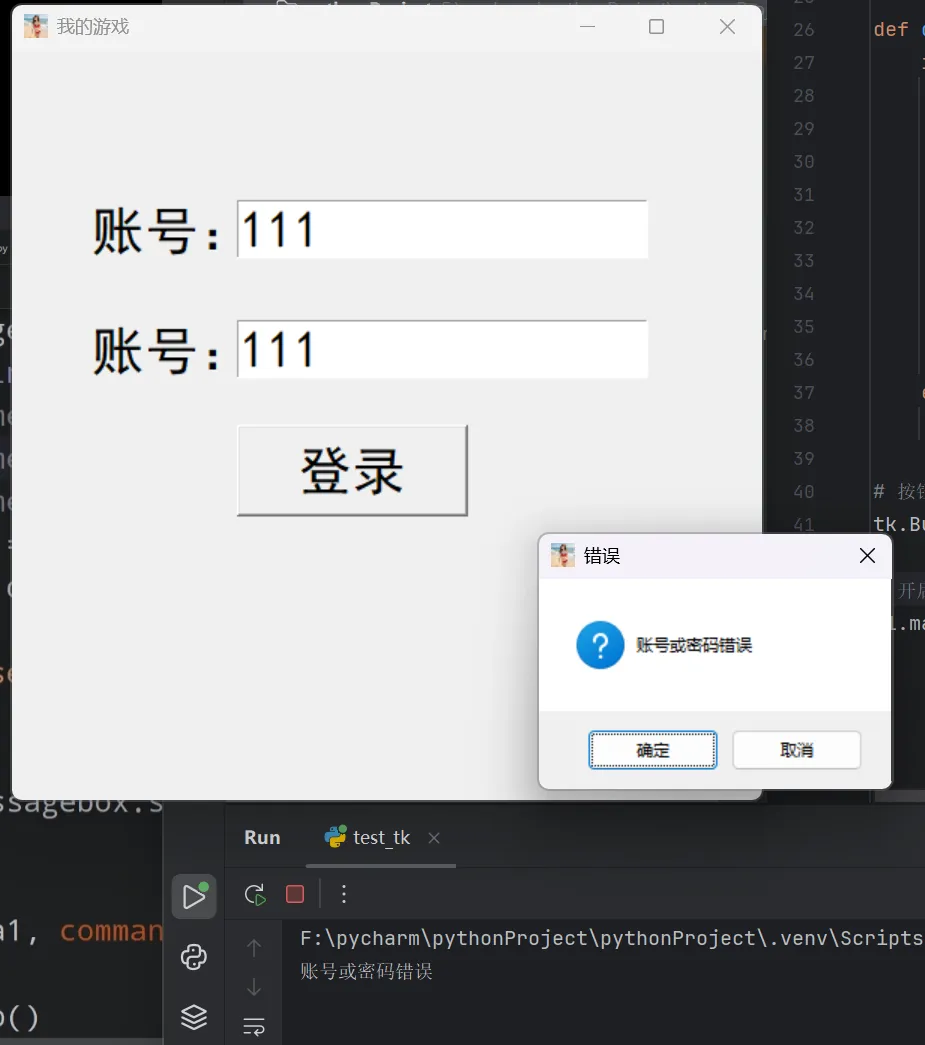 # 四种弹窗组件 messageboximport tkinter as tkfrom tkinter import messageboxa1 = tk.Tk()a1.title('我的游戏')a1.geometry('500x500+100+100')a1.resizable(width=True, height=True)a1.iconbitmap('logo1.ico')tk.Label(a1, text='账号:', font=('黑体', 26)).place(x=50, y=100)tk.Label(a1, text='账号:', font=('黑体', 26)).place(x=50, y=180)# 创建字符串变量s1 = tk.StringVar()# 当成提示文本s1.set('请输入账号')s2 = tk.StringVar()s2.set('请输入密码')# 输入框组件 Entrytk.Entry(a1, textvariable=s1, width=15, font=('黑体', 26)).place(x=150, y=100)tk.Entry(a1, textvariable=s2, width=15, font=('黑体', 26)).place(x=150, y=180)def d1():if s1.get() != '123'or s2.get() != '123':print('账号或密码错误')# messagebox.showerror('错误', '账号或密码错误')# messagebox.showinfo('错误', '账号或密码错误')# messagebox.showwarning('错误', '账号或密码错误')d2 = messagebox.askokcancel('错误', '账号或密码错误')if d2:print('点击了确定')else:print('点击了取消')else:messagebox.showinfo('成功', '登录成功')# 按钮组件tk.Button(a1, command=d1, text='登录', font=('黑体', 26), width=8).place(x=150, y=250)# 开启窗口/主循环a1.mainloop()