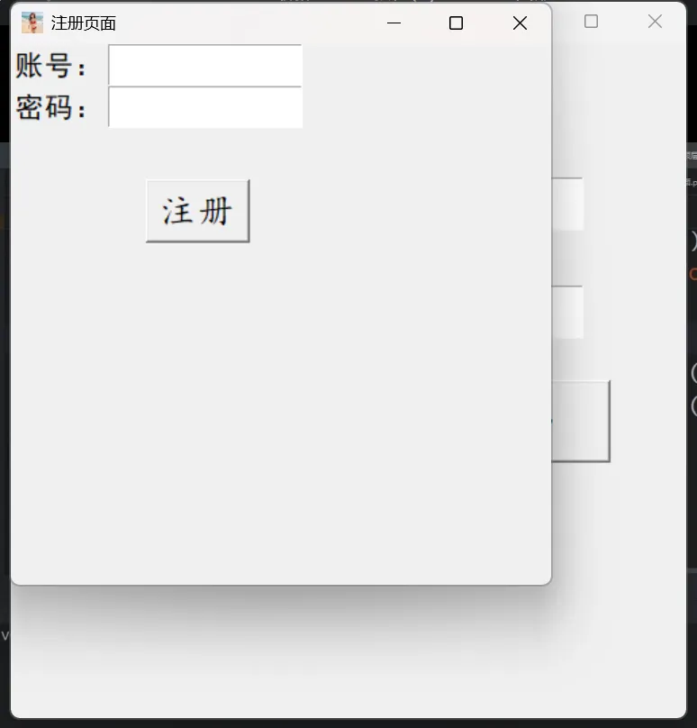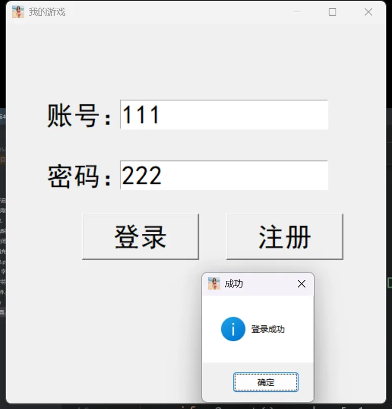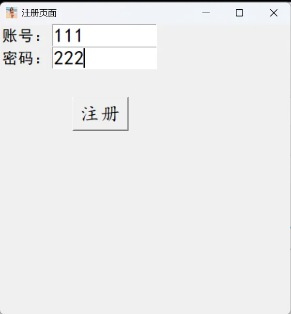 # 完善注册页面import tkinter as tkfrom tkinter import messageboxhao = {}a2 = Nonea1 = tk.Tk()a1.title('我的游戏')a1.geometry('500x500+100+100')a1.resizable(width=True, height=True)a1.iconbitmap('logo1.ico')s1 = tk.StringVar()s1.set('请输入账号')s2 = tk.StringVar()s2.set('请输入密码')s3 = tk.StringVar()s3.set('请输入账号')s4 = tk.StringVar()s4.set('请输入密码')tk.Label(a1, text='账号:', font=('黑体', 26)).place(x=50, y=100)tk.Label(a1, text='密码:', font=('黑体', 26)).place(x=50, y=180)# 输入框组件 Entrytk.Entry(a1, textvariable=s1, width=15, font=('黑体', 26)).place(x=150, y=100)tk.Entry(a1, textvariable=s2, width=15, font=('黑体', 26)).place(x=150, y=180)def guan():d1 = messagebox.askokcancel('是否关闭', '确认关闭吗?')if d1:a1.destroy()else:passa1.protocol('WM_DELETE_WINDOW', guan)def d1():if s1.get() in hao:if s2.get() == hao[s1.get()]:messagebox.showinfo('成功', '登录成功')else:messagebox.showerror('错误', '密码不正确')else:messagebox.showerror('错误', '账号不存在')def zc2():global haoif s3.get() not in hao:hao[s3.get()] = s4.get()messagebox.showinfo('成功', '注册成功')print(hao)a2.destroy()else:messagebox.showerror('错误', '账号已存在')def zc():global a2a2 = tk.Toplevel()a2.title('注册页面')a2.geometry('400x400+100+100')a2.resizable(width=True, height=True)a2.iconbitmap('logo1.ico')tk.Label(a2, text='账号:', font=('黑体', 16)).grid(row=1, column=1)tk.Label(a2, text='密码:', font=('黑体', 16)).grid(row=2, column=1)tk.Entry(a2, textvariable=s3, width=10, font=('楷体', 20)).grid(row=1, column=2)tk.Entry(a2, textvariable=s4, width=10, font=('楷体', 20)).grid(row=2, column=2)tk.Button(a2, command=zc2, text='注册', font=('楷体', 20)).place(x=100, y=100)# 按钮组件tk.Button(a1, command=d1, text='登录', font=('黑体', 26), width=8).place(x=100, y=250)tk.Button(a1, command=zc, text='注册', font=('黑体', 26), width=8).place(x=290, y=250)# 开启窗口/主循环a1.mainloop()