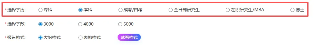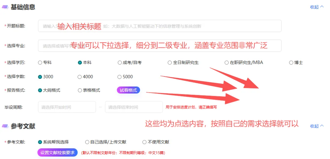 打开后直接填选题方向,再选好专业、学历,字数要求和其他信息。