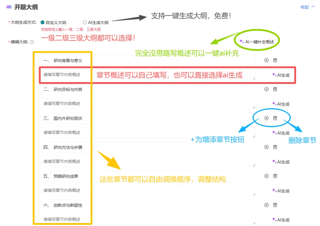 比如本科开题要加“研究方法详述”,硕士开题得补“创新点分析”,都能手动编辑。