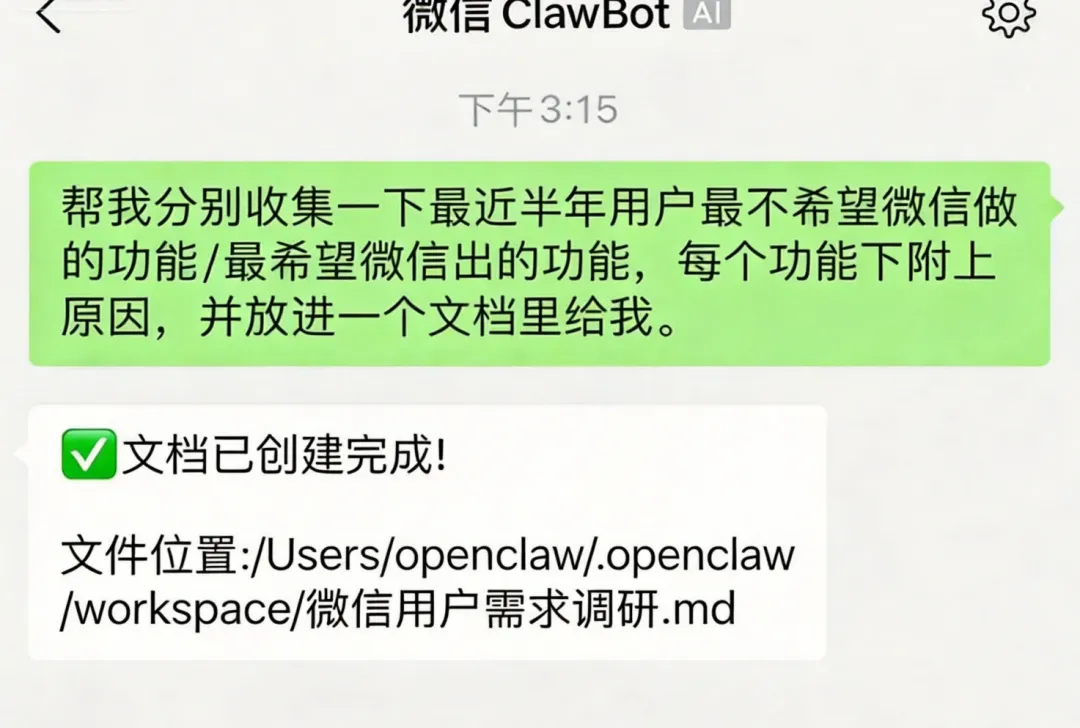 电脑上的 OpenClaw 就开始干活了。干完了把结果发回你的微信。