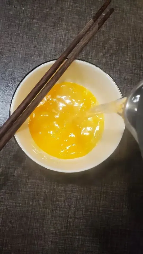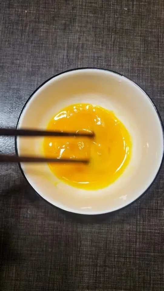 将鸡蛋打在碗里,加白糖和香油搅匀。