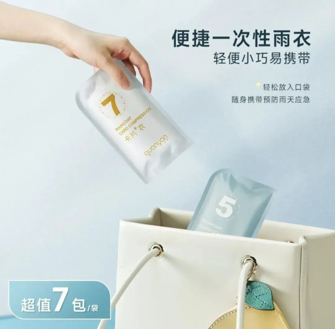 在这个快节奏的现代生活里,便携性早已成为选购随身物品的标准。这款雨披颠覆了传统雨衣笨重臃肿的设计,采用创新压缩卡片式包装,压缩后的体积薄如名片,真正实现了精致小巧。无论是揣进牛仔裤口袋、放进随身的挎包,还是塞进行李箱的缝隙,都不占空间,轻松实现“零负担携带”。相较于传统雨衣折叠后依旧庞大的体积,这款压缩卡片雨披随身携带毫无压力,彻底告别随身携带的负担,让轻便出行成为常态。