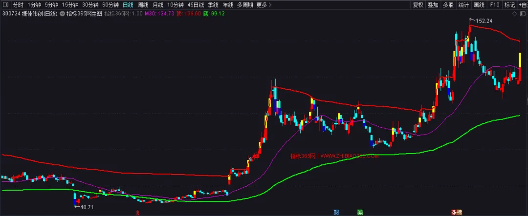 公式为日线级别的主图指标,适用于 A 股全市场,辅助中线波段分析 。