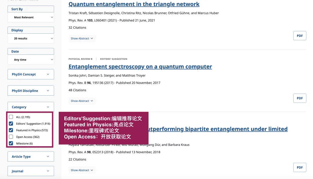 在检索结果页面左侧的精炼选项中,可以按照“Category”筛选出重点论文,包括编辑推荐论文、亮点论文和里程碑式论文。