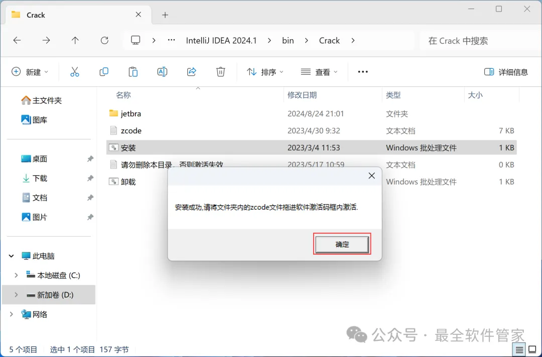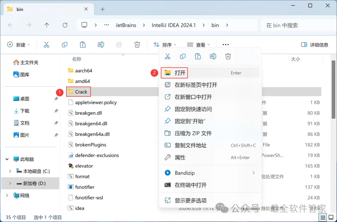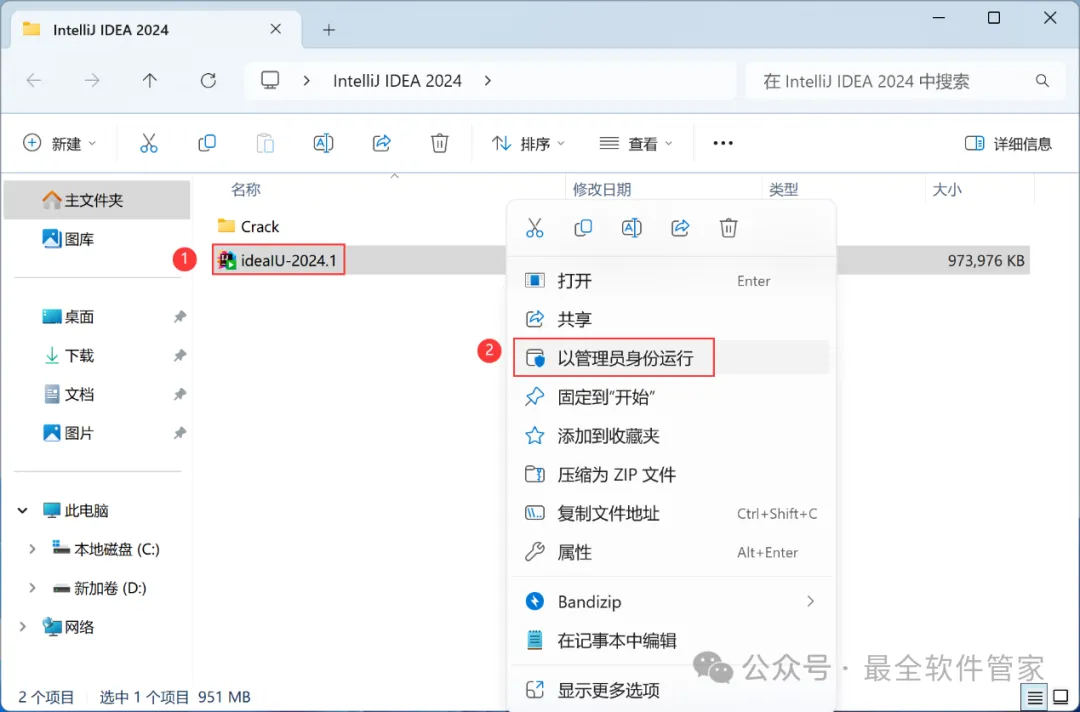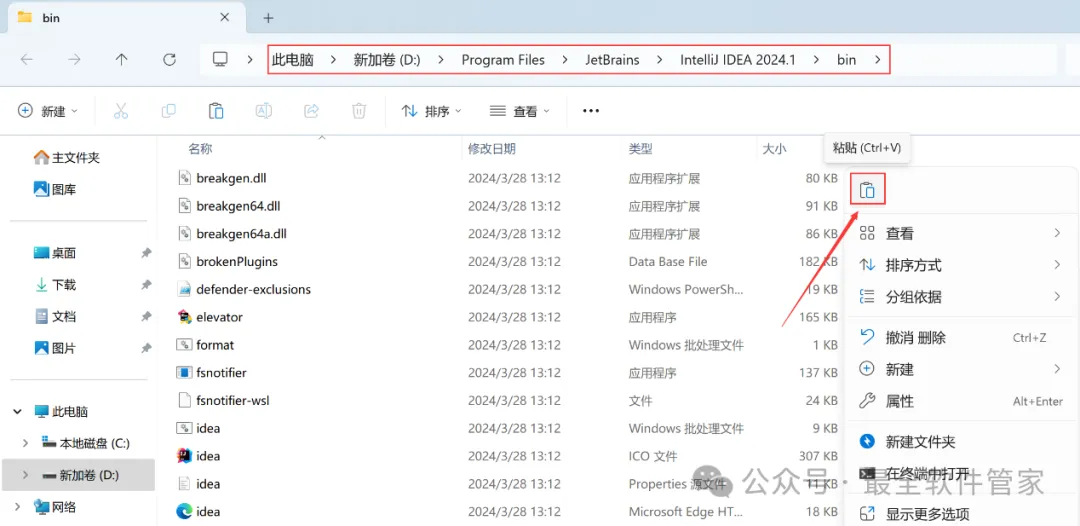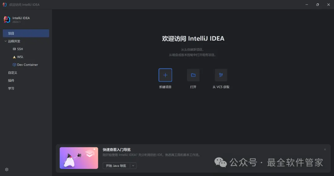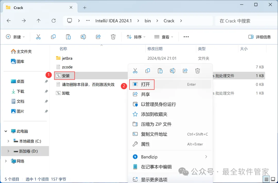 安装需知[软件名称]:IntelliJ IDEA 2024[软件大小]:951MB[软件语言]:中文简体[安装环境]:Win7及以上版本[下载地址]:公众号内回复:IDEA[不限速下载]:免费获取百度网盘不限速下载工具。公众号内回复:不限速[注意事项]:安装前请关闭网络、杀毒软件和防火墙,否则易安装失败。公众号内回复:1[解压软件]:小编用的解压软件是Bandizip,获取Bandizip软件安装包。公众号内回复:2安装教程1、下载IntelliJ IDEA 2024软件安装包到电脑上,右键选择【解压到IntelliJ IDEA 2024\】2、右键【打开】解压后的文件夹3、找到【ideaIU-2024.1】应用程序,右键选择【以管理员身份运行】它4、点击【下一步】5、软件默认安装在C盘,可自定义更改软件安装位置,这里小编选择安装在D盘;点击【下一步】6、勾选【创建IntelliJ IDEA桌面快捷方式】,再点击【下一步】7、点击【安装】8、软件安装中,稍等片刻9、点击【完成】10、回到IntelliJ IDEA 2024文件夹,找到【Crack】文件夹,右键点击【复制按钮】11、回到桌面,右键桌面上的【IntelliJ IDEA 2024.1软件图标】,点击【打开文件所在的位置】12、右键文件夹的空白处,点击【粘贴按钮】13、找到粘贴的【Crack】文件夹,右键【打开】它14、找到【安装】文件,右键点击【打开】15、点击【确定】16、点击【确定】17、点击【确定】18、回到桌面,右键桌面上的【IntelliJ IDEA 2024软件图标】,点击【打开】19、软件正在打开,启动界面如下:20、勾选【我确认】,再点击【继续】21、点击【不发送】22、点击【Activation IntelliJ IDEA】23、回到Crack文件夹,找到【zcode】文档,右键【打开】它24、全选右键【复制】全部内容25、回到IntelliJ IDEA 2024软件界面,点击【Activation code】,再右键的空白处,点击【Paste】26、点击【Activate】27、点击【Continue】28、点击左侧【Plugins】,搜索框搜索【Chinese】,找到Chinese(Simplified)语言包,再点击【Install】29、点击【Restart IDE】30、点击【Restart】31、软件打开成功,中文运行界面如下:32、以上就是IntelliJ IDEA 2024软件安装的全过程,要是对你有帮助的话,请为小编点个赞!免责声明:软件资源均来源于网络,仅供用户交流学习与研究使用,版权归属原版权方所有,版权争议与本公众号无关,用户本人下载后不能用作商业或非法用途,否则后果均由用户承担责任;如果您访问和下载此文件,表示您同意只将此软件用于参考、学习而非其他用途,否则一切后果请您自行承担,请于下载后24小时内删除,不允许用于商业用途,否则法律问题自行承担。如果您喜欢该软件,请支持正版软件,购买注册,得到更好的正版服务。