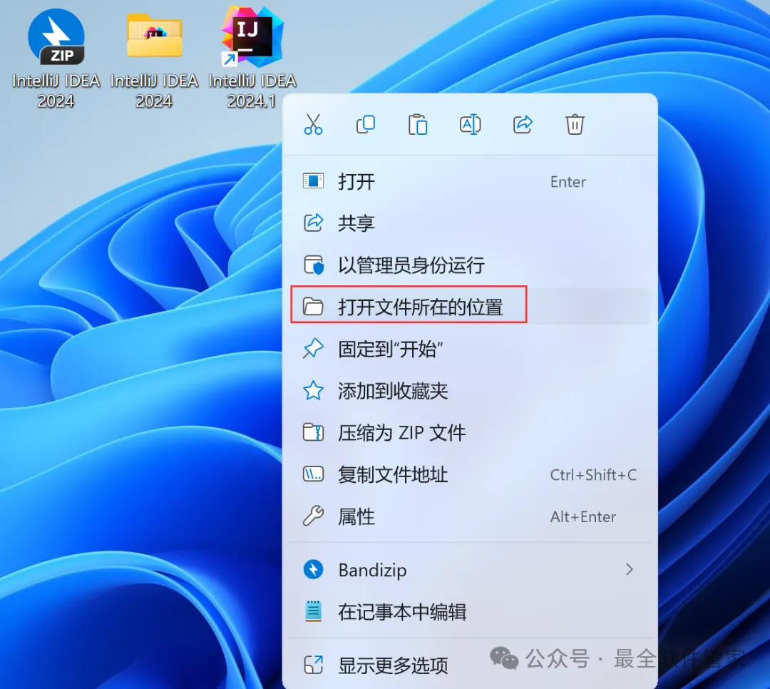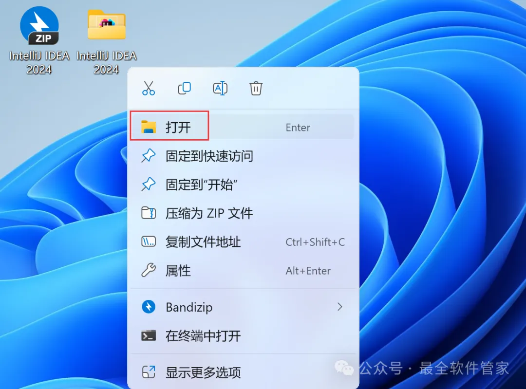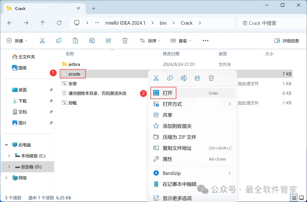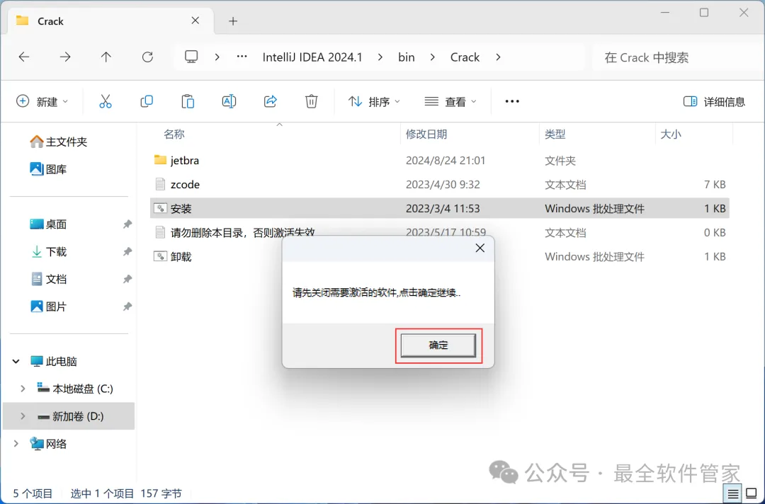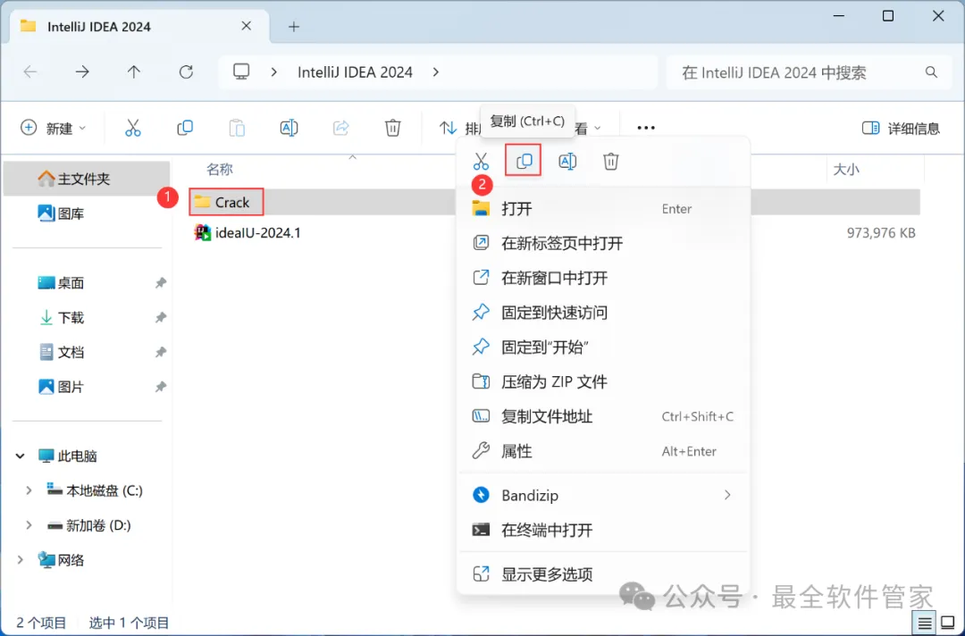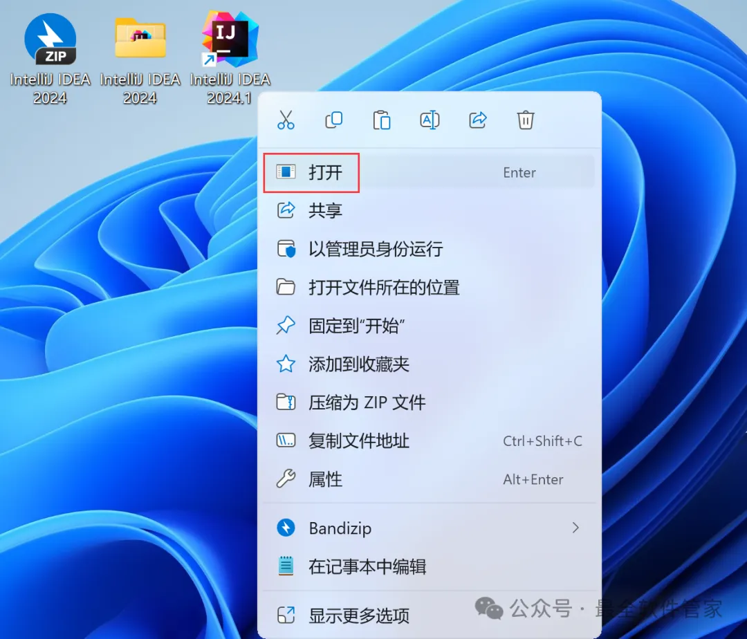 安装需知[软件名称]:IntelliJ IDEA 2024[软件大小]:951MB[软件语言]:中文简体[安装环境]:Win7及以上版本[下载地址]:公众号内回复:IDEA[不限速下载]:免费获取百度网盘不限速下载工具。公众号内回复:不限速[注意事项]:安装前请关闭网络、杀毒软件和防火墙,否则易安装失败。公众号内回复:1[解压软件]:小编用的解压软件是Bandizip,获取Bandizip软件安装包。公众号内回复:2安装教程1、下载IntelliJ IDEA 2024软件安装包到电脑上,右键选择【解压到IntelliJ IDEA 2024\】2、右键【打开】解压后的文件夹3、找到【ideaIU-2024.1】应用程序,右键选择【以管理员身份运行】它4、点击【下一步】5、软件默认安装在C盘,可自定义更改软件安装位置,这里小编选择安装在D盘;点击【下一步】6、勾选【创建IntelliJ IDEA桌面快捷方式】,再点击【下一步】7、点击【安装】8、软件安装中,稍等片刻9、点击【完成】10、回到IntelliJ IDEA 2024文件夹,找到【Crack】文件夹,右键点击【复制按钮】11、回到桌面,右键桌面上的【IntelliJ IDEA 2024.1软件图标】,点击【打开文件所在的位置】12、右键文件夹的空白处,点击【粘贴按钮】13、找到粘贴的【Crack】文件夹,右键【打开】它14、找到【安装】文件,右键点击【打开】15、点击【确定】16、点击【确定】17、点击【确定】18、回到桌面,右键桌面上的【IntelliJ IDEA 2024软件图标】,点击【打开】19、软件正在打开,启动界面如下:20、勾选【我确认】,再点击【继续】21、点击【不发送】22、点击【Activation IntelliJ IDEA】23、回到Crack文件夹,找到【zcode】文档,右键【打开】它24、全选右键【复制】全部内容25、回到IntelliJ IDEA 2024软件界面,点击【Activation code】,再右键的空白处,点击【Paste】26、点击【Activate】27、点击【Continue】28、点击左侧【Plugins】,搜索框搜索【Chinese】,找到Chinese(Simplified)语言包,再点击【Install】29、点击【Restart IDE】30、点击【Restart】31、软件打开成功,中文运行界面如下:32、以上就是IntelliJ IDEA 2024软件安装的全过程,要是对你有帮助的话,请为小编点个赞!免责声明:软件资源均来源于网络,仅供用户交流学习与研究使用,版权归属原版权方所有,版权争议与本公众号无关,用户本人下载后不能用作商业或非法用途,否则后果均由用户承担责任;如果您访问和下载此文件,表示您同意只将此软件用于参考、学习而非其他用途,否则一切后果请您自行承担,请于下载后24小时内删除,不允许用于商业用途,否则法律问题自行承担。如果您喜欢该软件,请支持正版软件,购买注册,得到更好的正版服务。