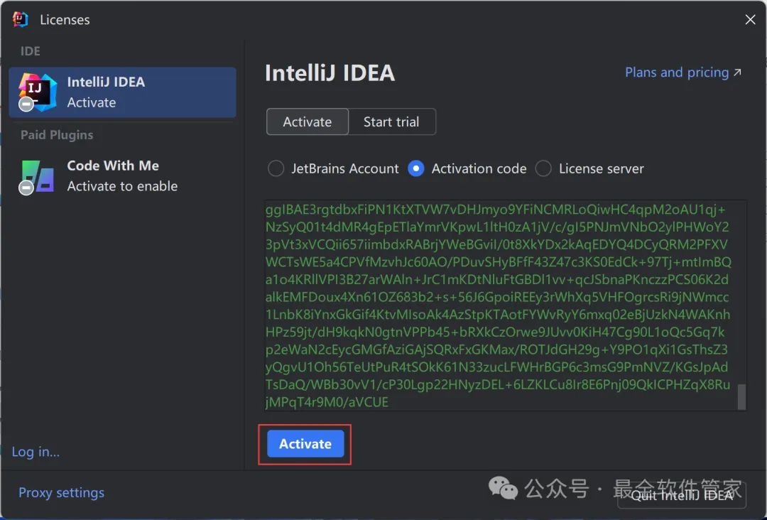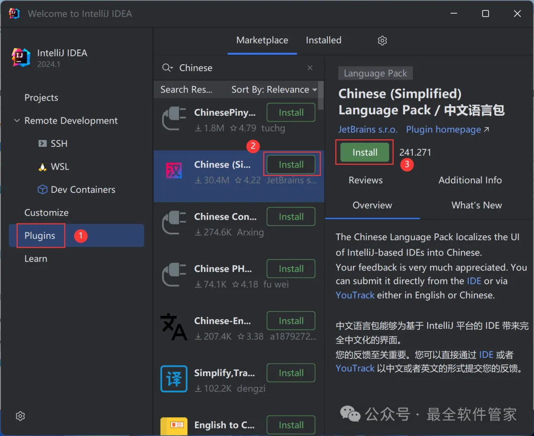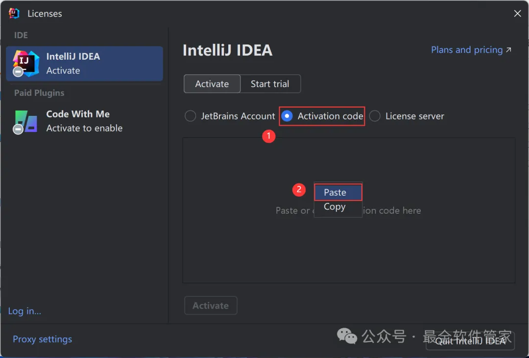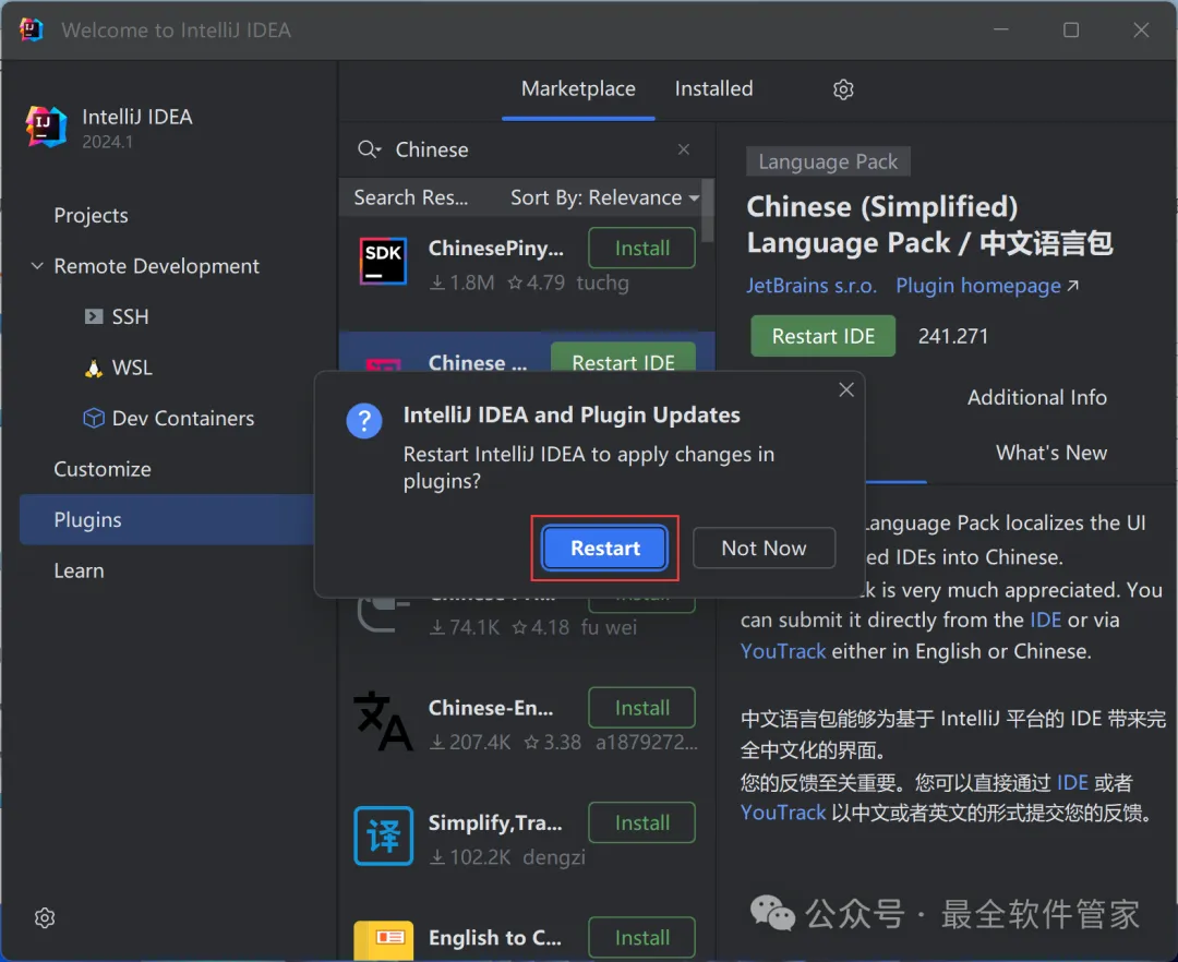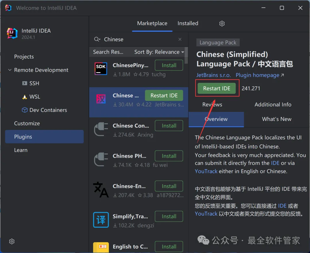 安装需知[软件名称]:IntelliJ IDEA 2024[软件大小]:951MB[软件语言]:中文简体[安装环境]:Win7及以上版本[下载地址]:公众号内回复:IDEA[不限速下载]:免费获取百度网盘不限速下载工具。公众号内回复:不限速[注意事项]:安装前请关闭网络、杀毒软件和防火墙,否则易安装失败。公众号内回复:1[解压软件]:小编用的解压软件是Bandizip,获取Bandizip软件安装包。公众号内回复:2安装教程1、下载IntelliJ IDEA 2024软件安装包到电脑上,右键选择【解压到IntelliJ IDEA 2024\】2、右键【打开】解压后的文件夹3、找到【ideaIU-2024.1】应用程序,右键选择【以管理员身份运行】它4、点击【下一步】5、软件默认安装在C盘,可自定义更改软件安装位置,这里小编选择安装在D盘;点击【下一步】6、勾选【创建IntelliJ IDEA桌面快捷方式】,再点击【下一步】7、点击【安装】8、软件安装中,稍等片刻9、点击【完成】10、回到IntelliJ IDEA 2024文件夹,找到【Crack】文件夹,右键点击【复制按钮】11、回到桌面,右键桌面上的【IntelliJ IDEA 2024.1软件图标】,点击【打开文件所在的位置】12、右键文件夹的空白处,点击【粘贴按钮】13、找到粘贴的【Crack】文件夹,右键【打开】它14、找到【安装】文件,右键点击【打开】15、点击【确定】16、点击【确定】17、点击【确定】18、回到桌面,右键桌面上的【IntelliJ IDEA 2024软件图标】,点击【打开】19、软件正在打开,启动界面如下:20、勾选【我确认】,再点击【继续】21、点击【不发送】22、点击【Activation IntelliJ IDEA】23、回到Crack文件夹,找到【zcode】文档,右键【打开】它24、全选右键【复制】全部内容25、回到IntelliJ IDEA 2024软件界面,点击【Activation code】,再右键的空白处,点击【Paste】26、点击【Activate】27、点击【Continue】28、点击左侧【Plugins】,搜索框搜索【Chinese】,找到Chinese(Simplified)语言包,再点击【Install】29、点击【Restart IDE】30、点击【Restart】31、软件打开成功,中文运行界面如下:32、以上就是IntelliJ IDEA 2024软件安装的全过程,要是对你有帮助的话,请为小编点个赞!免责声明:软件资源均来源于网络,仅供用户交流学习与研究使用,版权归属原版权方所有,版权争议与本公众号无关,用户本人下载后不能用作商业或非法用途,否则后果均由用户承担责任;如果您访问和下载此文件,表示您同意只将此软件用于参考、学习而非其他用途,否则一切后果请您自行承担,请于下载后24小时内删除,不允许用于商业用途,否则法律问题自行承担。如果您喜欢该软件,请支持正版软件,购买注册,得到更好的正版服务。