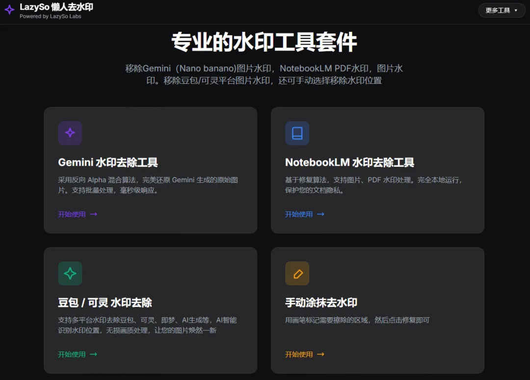 专业的水印工具套件,其功能十分强大,能移除多种平台图片及 PDF 文档上的水印,包括 Gemini(Nano banano)图片水印、NotebookLM PDF 水印、豆包与可灵平台图片水印等,还支持手动选择移除水印的位置。直接上传图片就能获得专业级的去水印处理,操作简便。