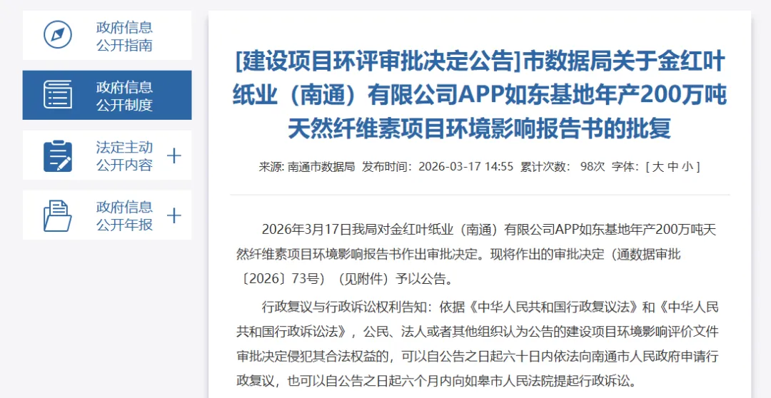 APP金红叶新项目获批!年产200万吨天然纤维素 金红叶纸业 3月17日,南通市数据局对金红叶纸业(南通)有限公司APP如东基地年产200万吨天然纤维素项目环境影响报告书作出审批决定。项目服务于如东基地生活造纸及规划四期项目,其中160万吨浆为现有厂内一期、二期生活用纸项目配套供应木浆,项目总投资约164亿元,建设周期36个月。 来源:南通市数据局 本文部分内容来源于网络,仅供分享学习,不作商业用途,版权归原作者所有,如有侵犯您的权益,请与我们联系删除,谢谢。