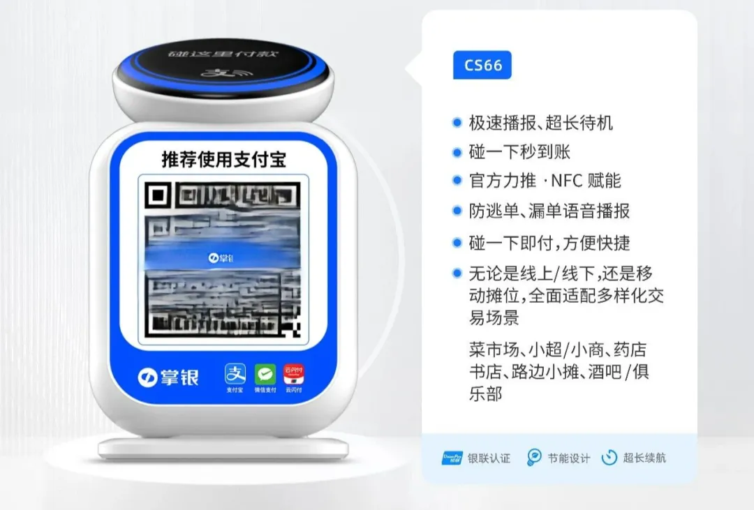 景区旺季收款神器,一码搞定全渠道 春暖花开,景区客流全线暴涨,正是全年赚大钱的黄金旺季!生意越火爆,收款越不能掉链子,千万别让低效收款,白白放走眼前的客流和利润! 生意越火爆,收款环节越不能掉链子,可绝大多数景区商家,都正被低效收款拖垮生意,明明客流爆满,营收却跟不上,看似热闹的背后,全是被忽略的收款漏洞,辛苦赚的钱,悄悄在收银台流失。 是不是还在被下面这些收款难题缠上身? 收银台贴满各类收款码,支付宝、微信、银联码堆在一起,顾客眯眼找码、反复切换,阳光刺眼看不清,耽误半分钟还付不好,支付体验直接拉胯,好感度瞬间清零。 用个人码收款省事却踩坑,额度说限就限,大额交易接不住,连续收款直接卡死,游客等着付款却没法成交,眼睁睁看着到手的生意溜走,旺季红利白白浪费。 更怕遇到恶意逃单,顾客扫码后悄悄取消支付、故意不完成付款,商家忙得脚不沾地没空核对,等发现时人已走远,辛苦赚的血汗钱就这么凭空流失。 高峰时段最闹心,传统扫码步骤繁琐,打开APP、找付款码、对准对焦、等待加载,一步不能少,遇上景区网络卡顿更慢,收银台排起长队,游客不耐烦直接放弃,效率压根跟不上暴涨的客流。 低成本开启高效经营 一码全渠道支付,告别杂乱与限额 掌银碰音响,单个收款码覆盖微信、支付宝、云闪付、花呗、信用卡等全主流支付渠道,不用再往墙面贴满各类收款码,顾客任选支付方式都便捷,大额订单也能顺畅承接,彻底规避因支付繁琐、额度受限造成的客源流失,牢牢守住每一笔生意! 碰一下秒到账,旺季收款快人一步 掌银碰音响快捷支付,手机轻触设备即可完成交易,到账实时同步提醒,告别扫码输码的繁琐流程,客流高峰期也能高效收银,不排长队、不耗时等待,即便人流量爆满也能从容应对,让收款效率跟上客流增速! 实时防逃单警告,守住每一分辛苦钱 搭载取消支付实时预警功能,一旦出现异常订单,设备即刻发出警告提示音,化身贴身“防逃单雷达”,精准预警每一笔交易风险,从源头封堵收款漏洞,保障每一分收入安稳落袋,旺季收款更稳妥! END